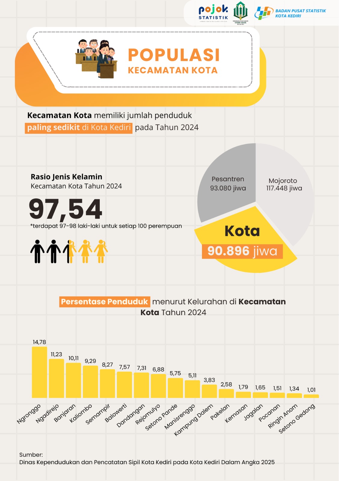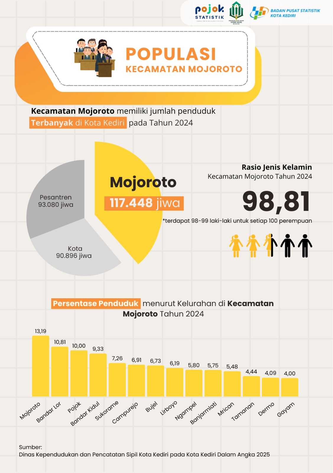 Kecamatan Mojoroto memiliki jumlah penduduk terbanyak di Kota Kediri pada tahun 2024 sebesar 117.448 jiwa.