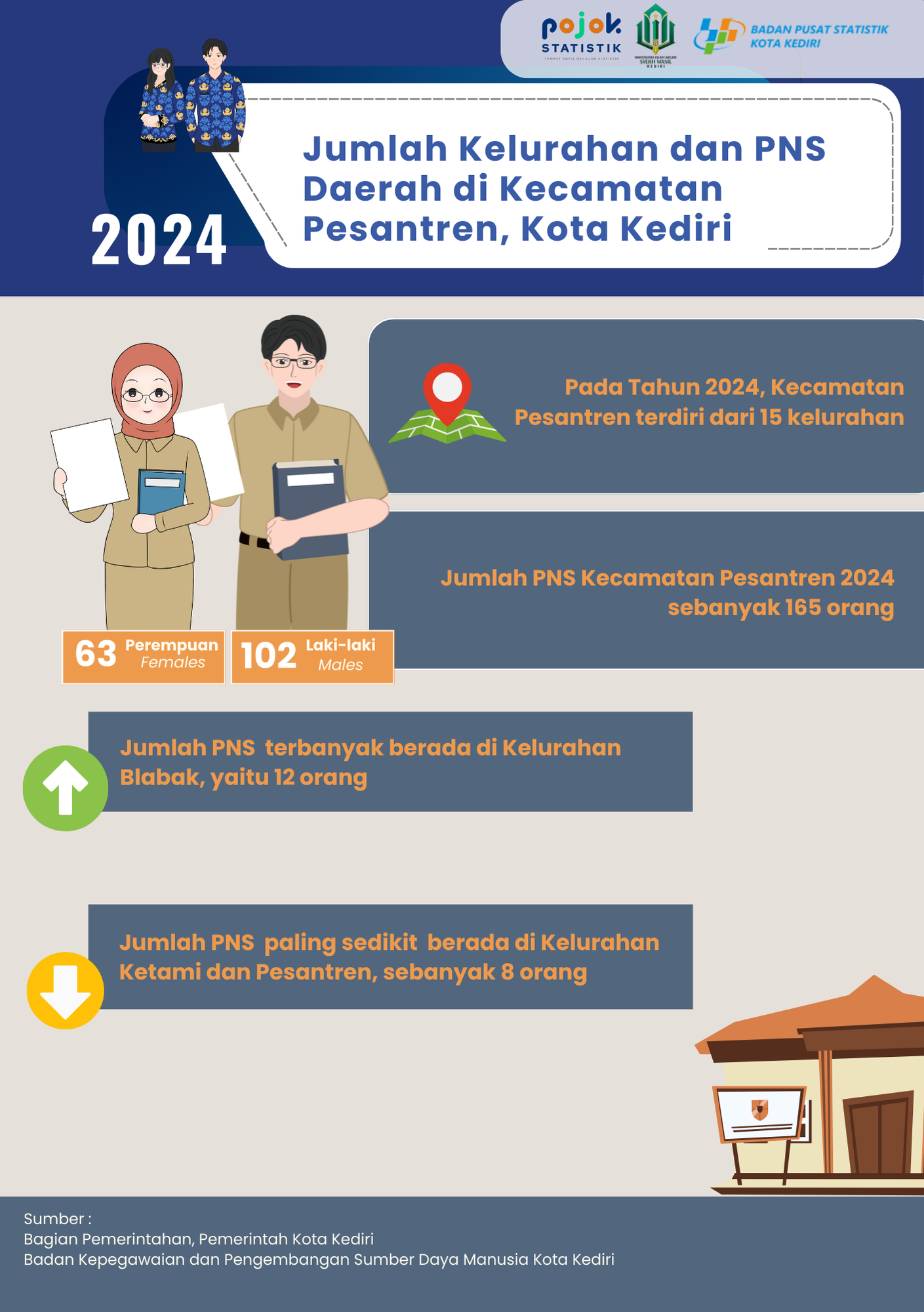 Jumlah Kelurahan dan PNS Daerah di Kecamatan Pesantren, Kota Kediri 2024