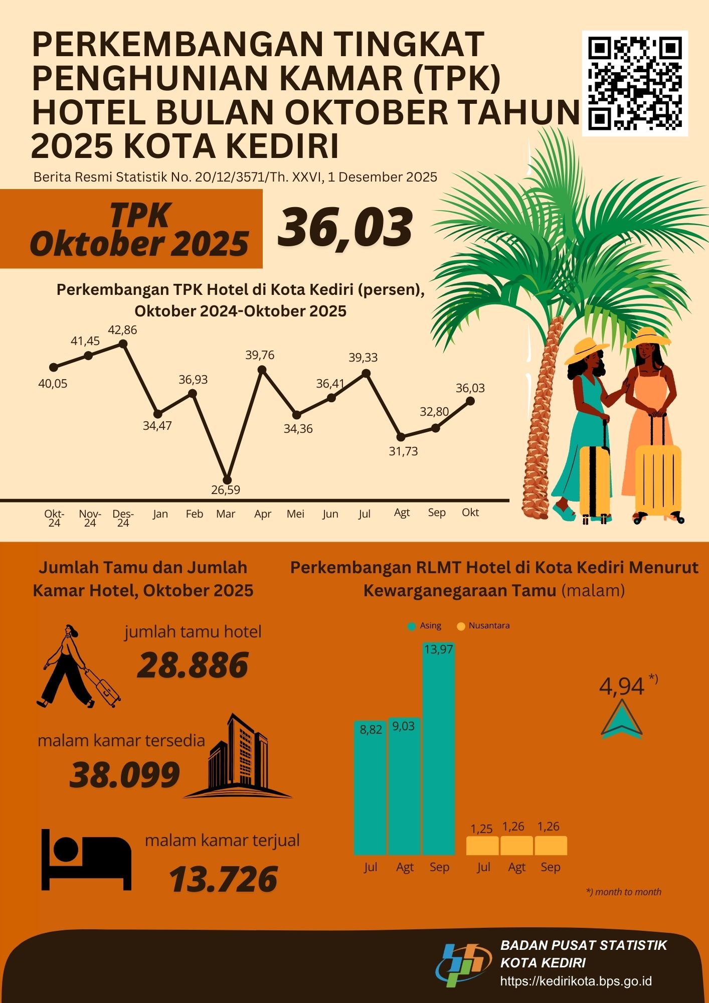 Tingkat penghunian kamar (TPK) hotel di Kota Kediri bulan Oktober tahun 2025 sebesar 36,03 persen