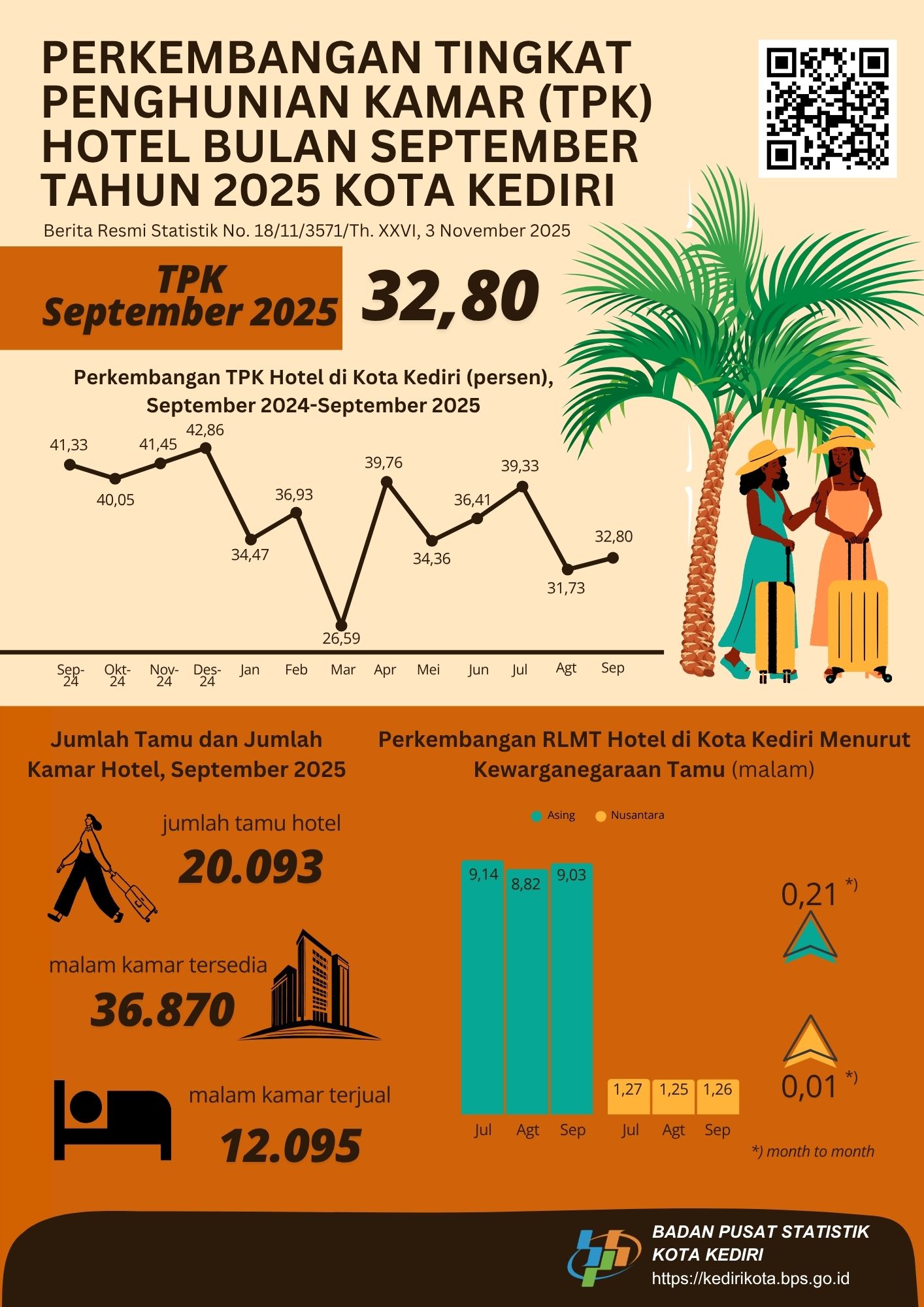 Tingkat penghunian kamar (TPK) hotel di Kota Kediri bulan September tahun 2025 sebesar 32,80 persen, lebih tinggi 1,07 poin dibandingkan TPK bulan sebelumnya.