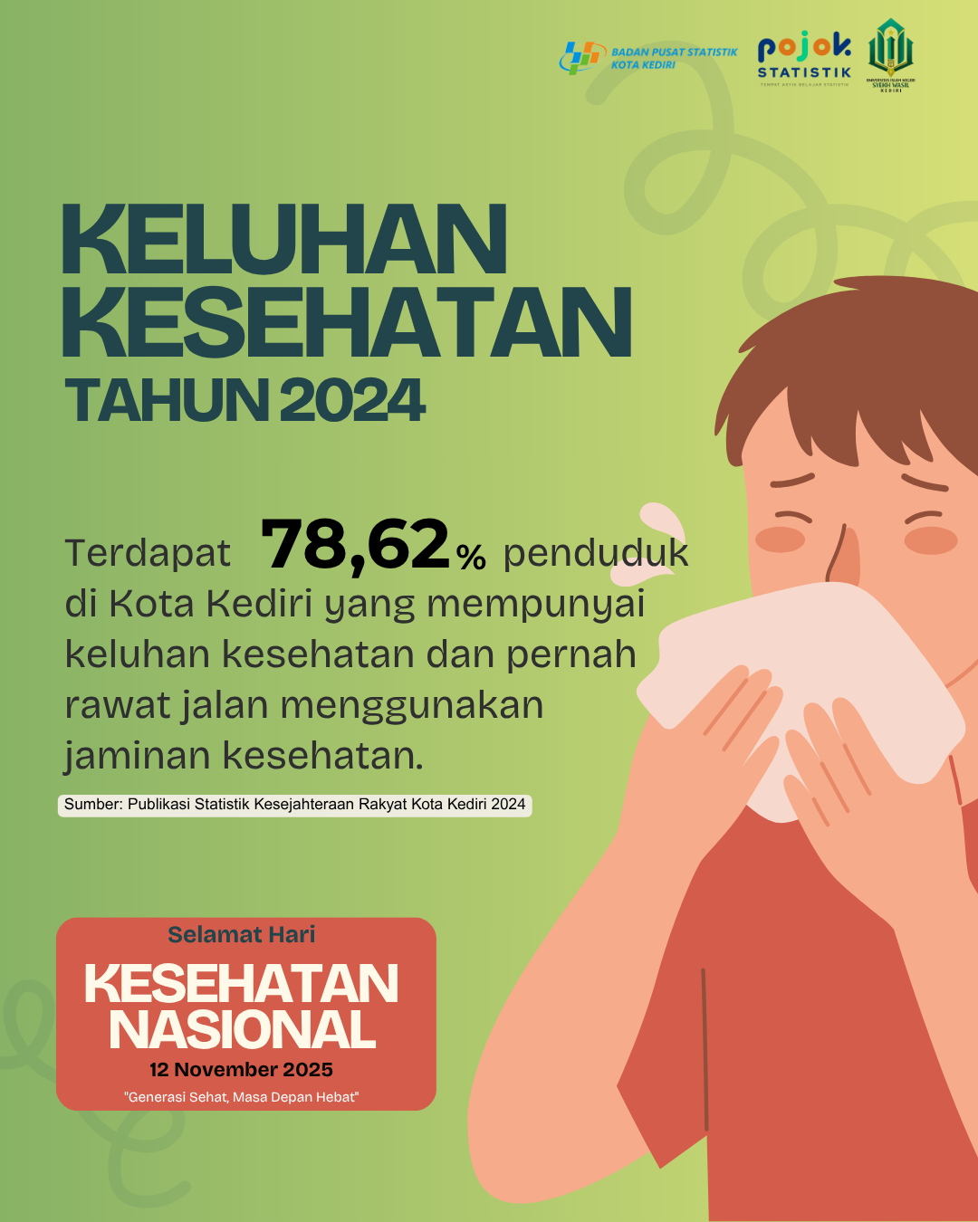 Terdapat 78,62 Persen penduduk di Kota Kediri pada tahun 2024, yang mempunyai keluhan kesehatan dan pernah rawat jalan menggunakan jaminan kesehatan.