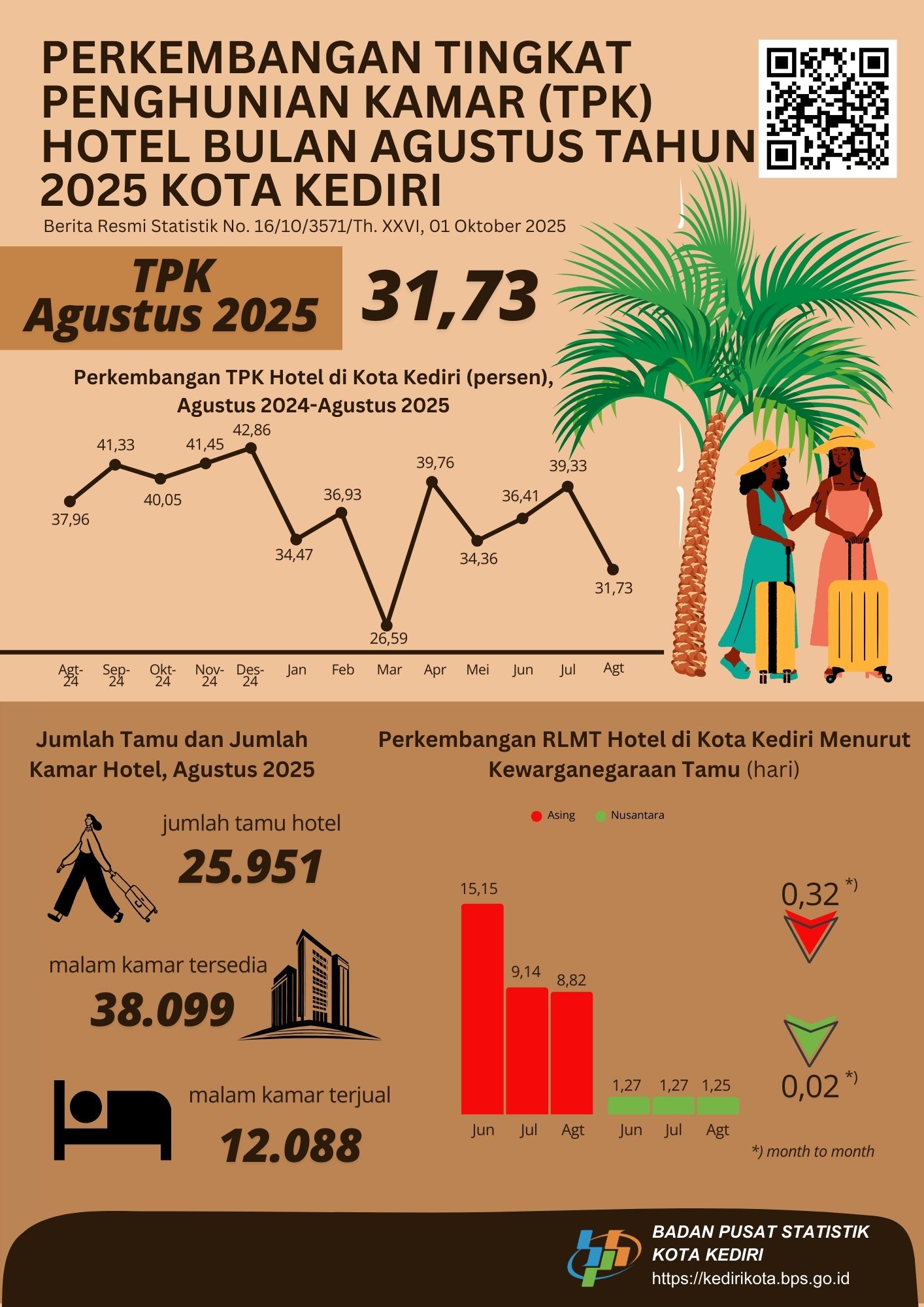 Tingkat penghunian kamar (TPK) hotel pada bulan Agustus tahun 2025 di Kota Kediri sebesar 31,73 persen