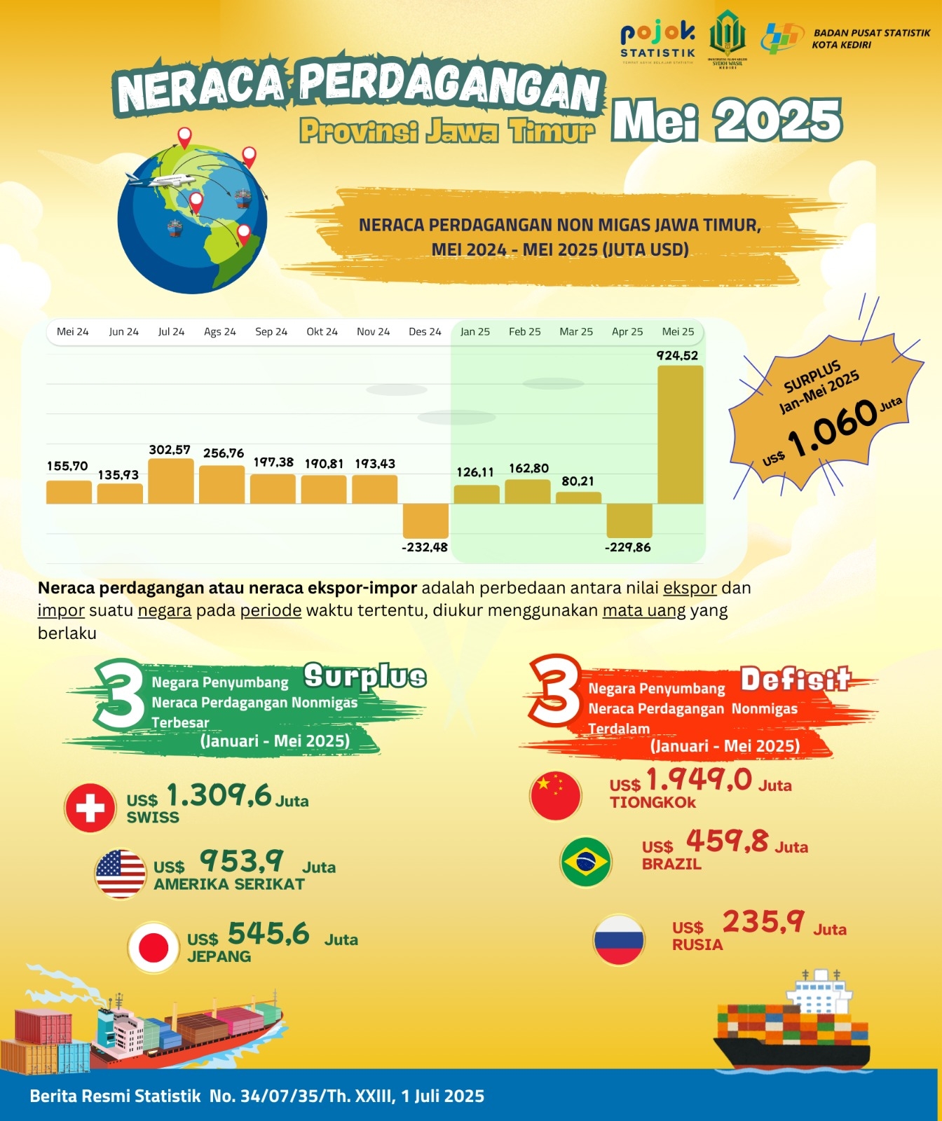 Pada periode Januari - Mei 2025, Neraca Perdagangan Non Migas Provinsi Jawa Timur mengalami surplus sebesar 1.060 juta US Dollar.