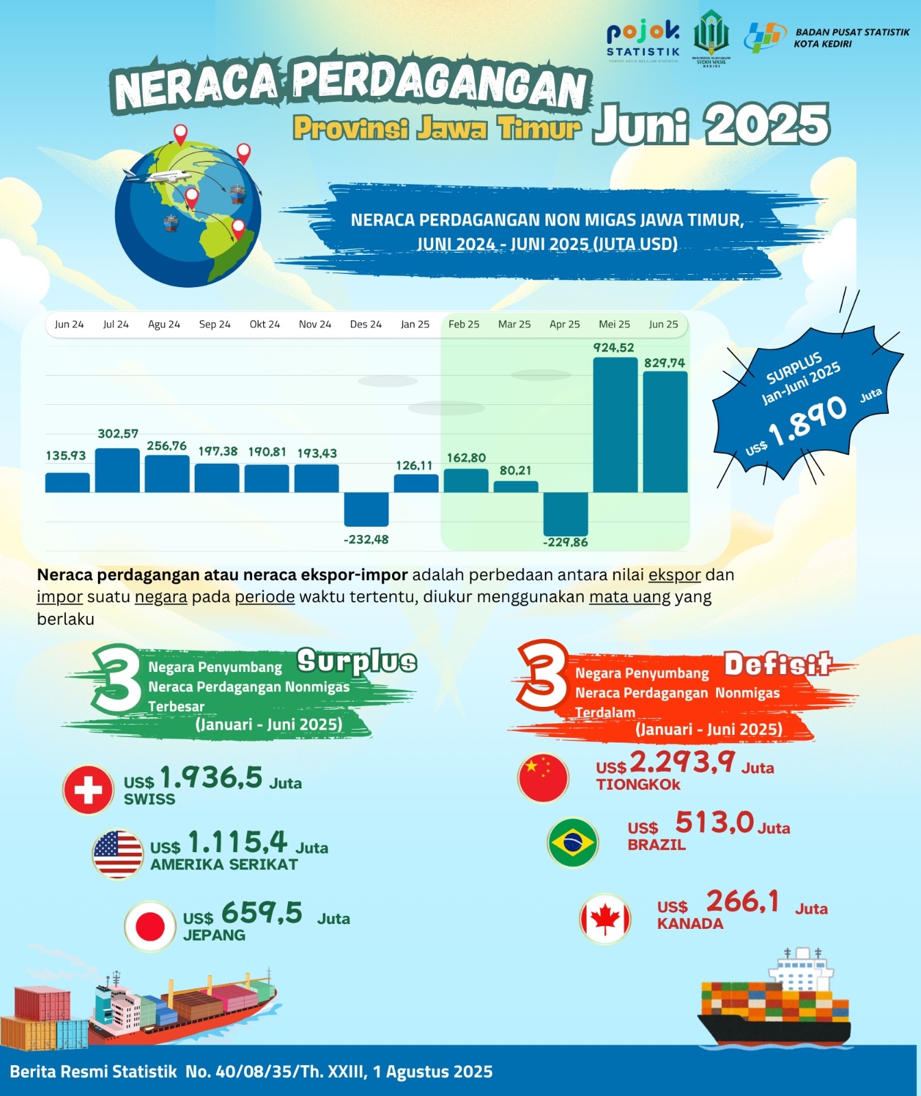 Pada Periode Januari - Juni 2025, Neraca Perdagangan Non Migas Provinsi Jawa Timur mengalami surplus sebesar 1.890 juta US Dollar.