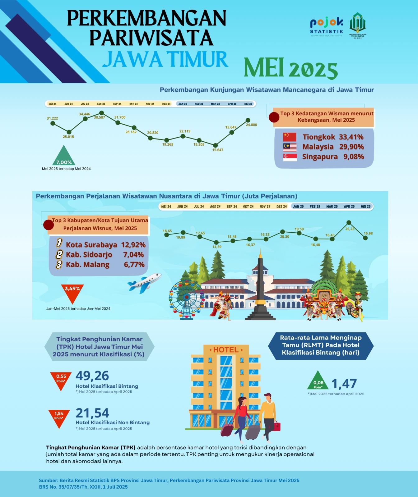 Rata-rata lama menginap tamu hotel (RLMT) secara umum pada bulan Juli tahun 2025 tidak mengalami perubahan yang signifikan dibandingkan bulan sebelumnya. RLMT asing pada bulan...