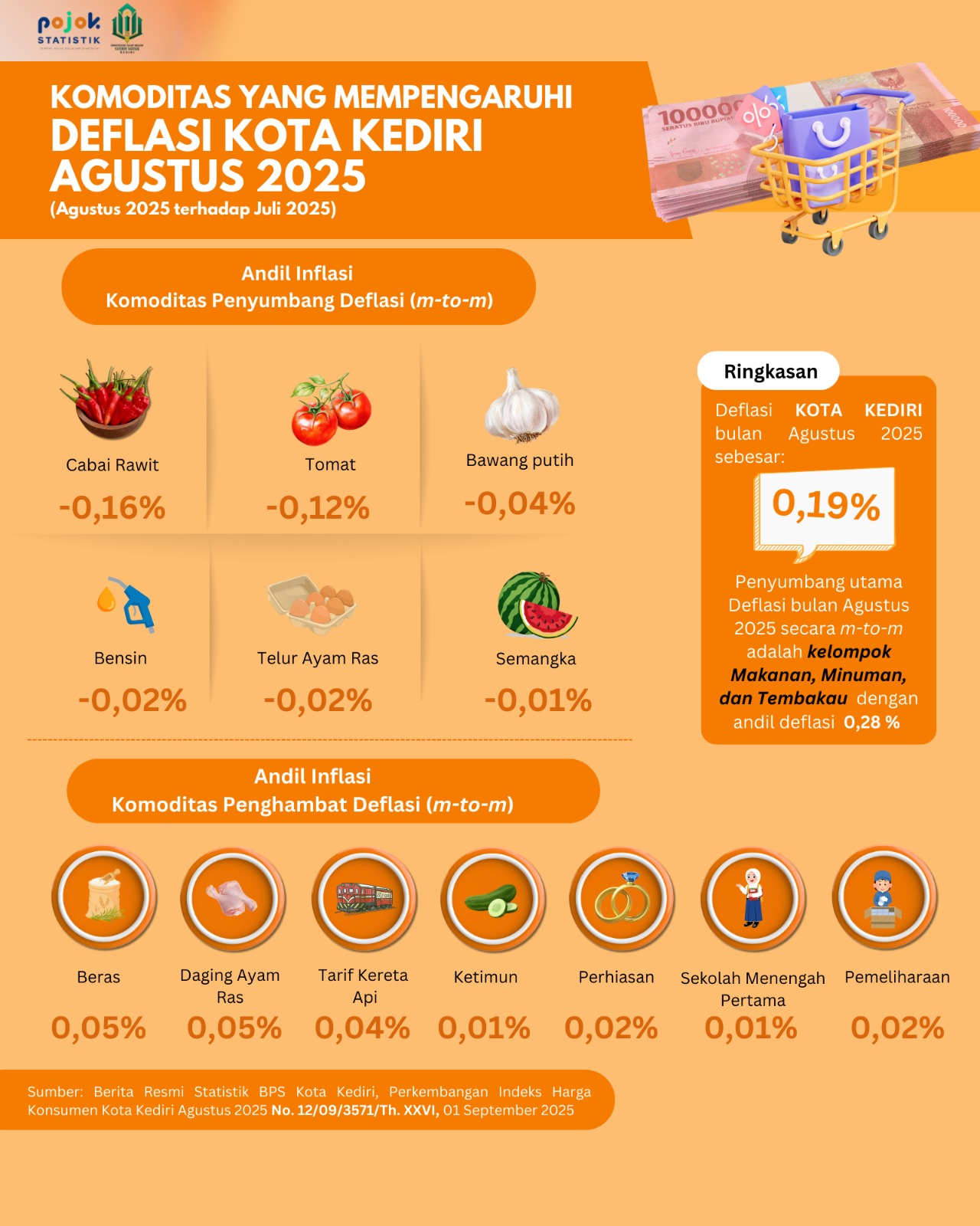 Pada bulan Agustus 2025 mengalami deflasi ( month to month) sebesar 0,19 persen. Beberapa komoditas penyumbang dan penghambat Inflasi dapat dilihat pada infografis