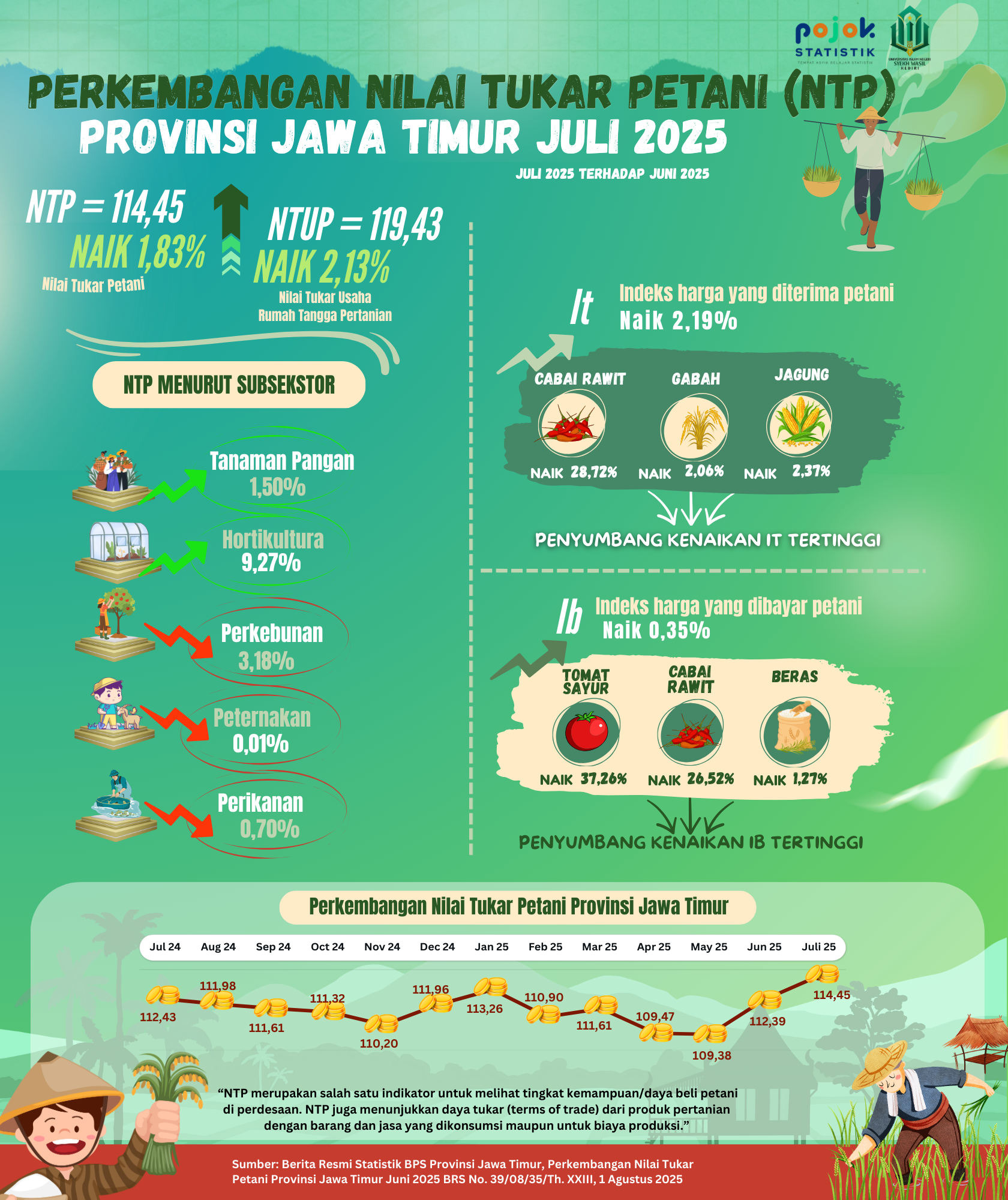 Pada Bulan Juli 2025 Nilai Tukar Petani Provinsi Jawa Timur naik 1,83 persen dibanding Juni 2025, kenaikan tertinggi pada subsektor Hortikultura.