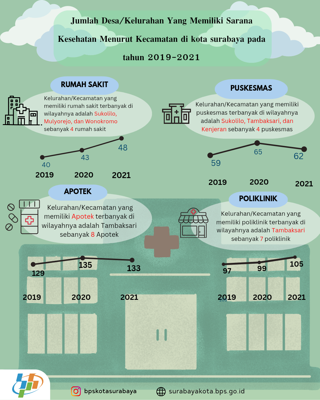jumlah desa_kelurahan dengan sarana kesehatan menurut kecamatan di kota Surabaya pada tahun 2019 hingga 2021