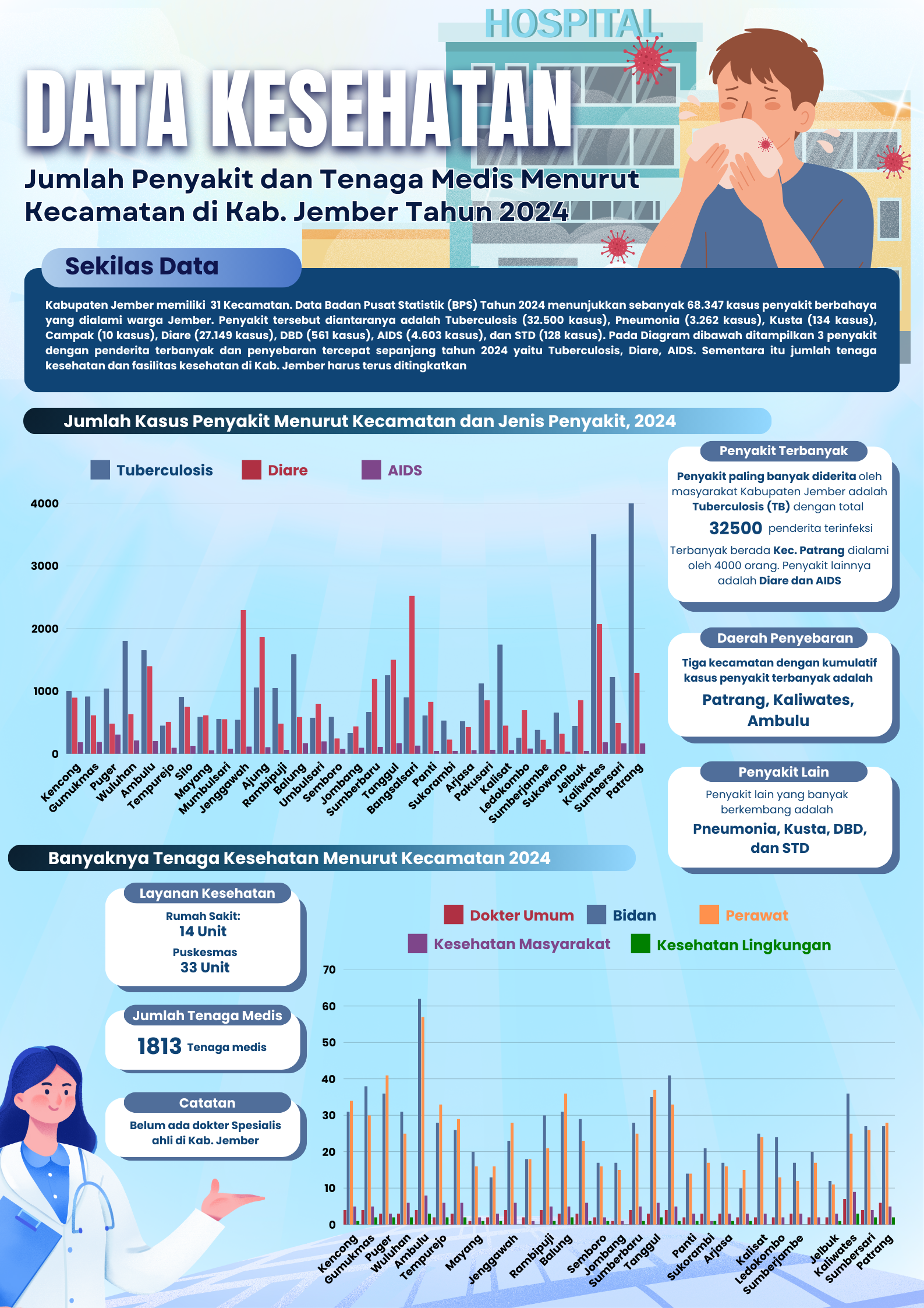 Jumlah penyakit dan tenaga medis menurut kecamatan di kab. jember tahun 2024