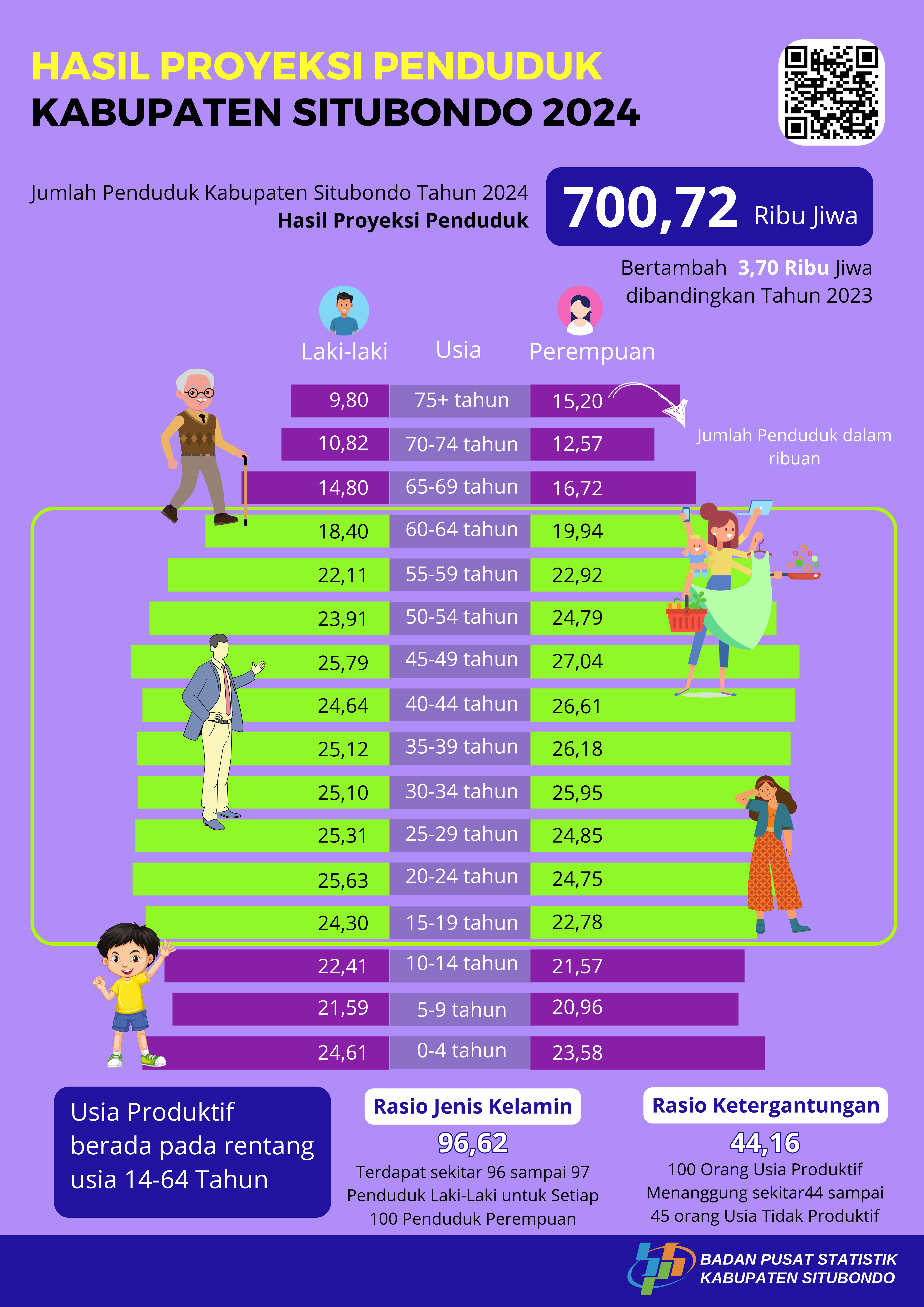 Jumlah penduduk Kabupaten Situbondo Tahun 2024 hasil proyeksi dari sensus penduduk tahun 2020 adalah sebesar 700,72 jiwa, meningkat sebesar 3,70 jiwa dibandingkan tahun 2023. Rasio...