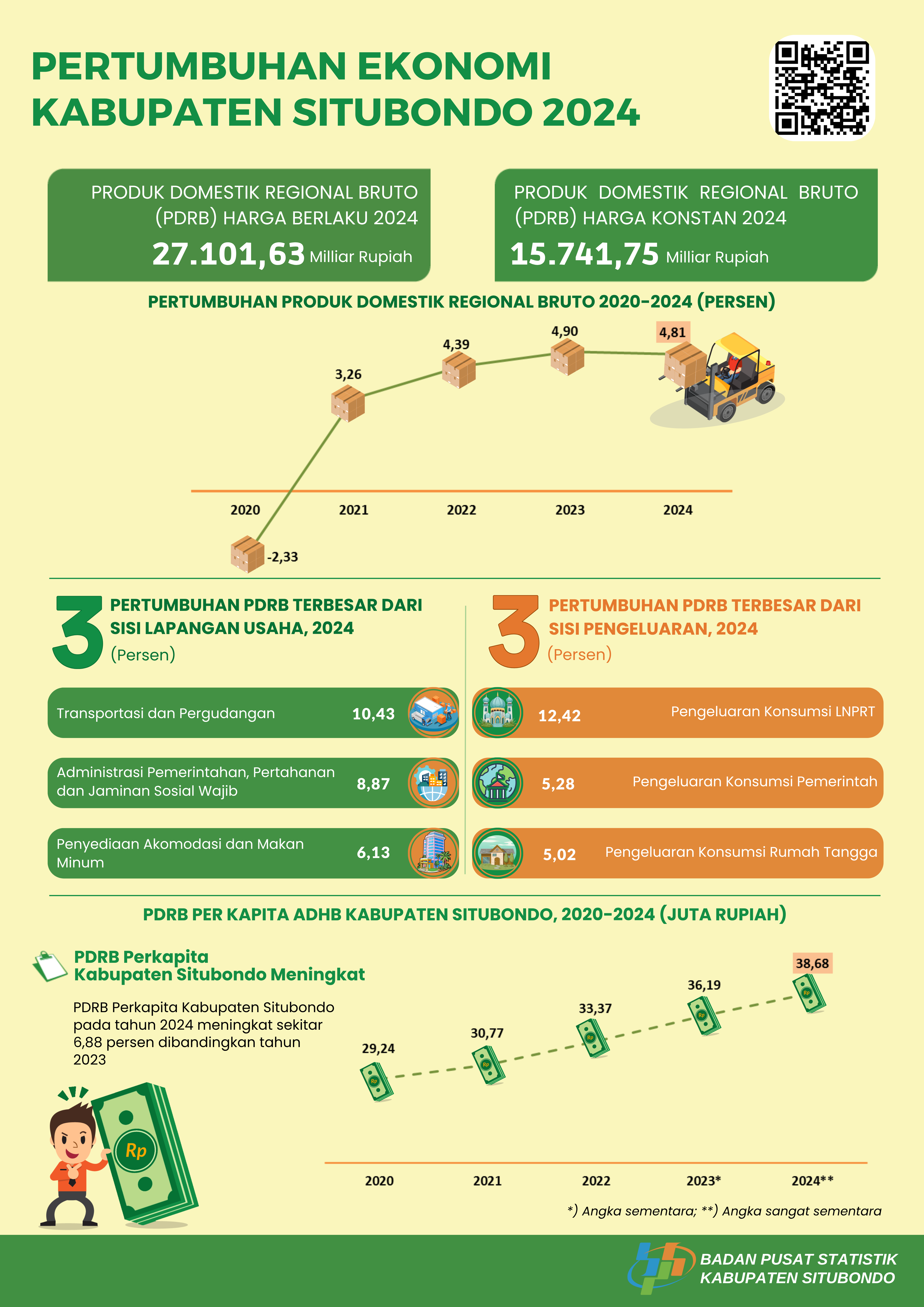 Perekonomian Kabupaten Situbondo tahun 2024 yang diukur berdasarkan Produk Domestik Regional Bruto (PDRB) atas dasar harga berlaku (ADHB) mencapai Rp. 27.101,63 Milyar, sedangkan PDRB atas...