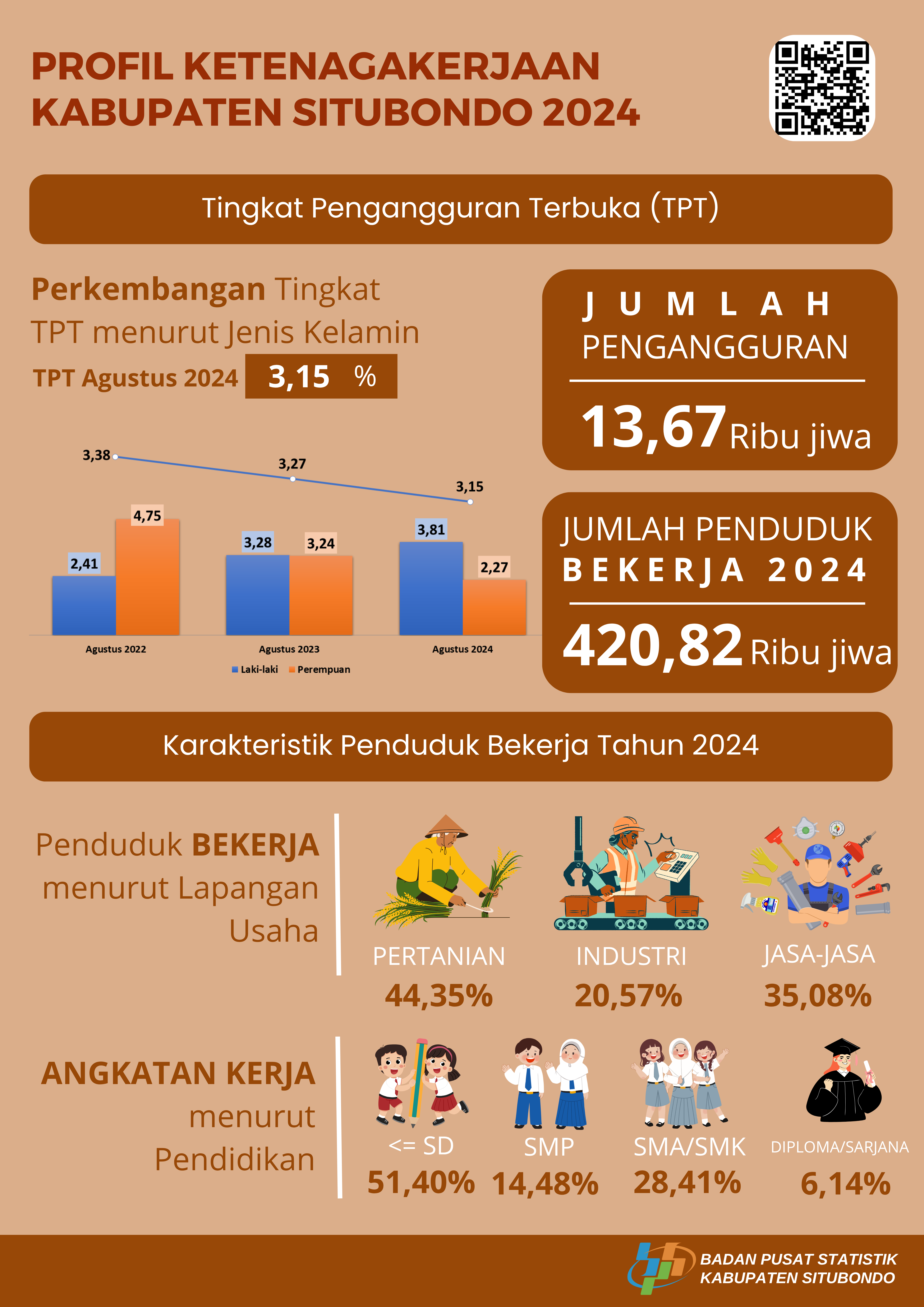 TPT Kabupaten Situbondo Agustus 2024 menurun menjadi 3,15 persen dibanding Agustus 2023 dengan TPT sebesar 3,27 persen. Jika dilihat menurut jenis kelamin, TPT Laki-laki di...