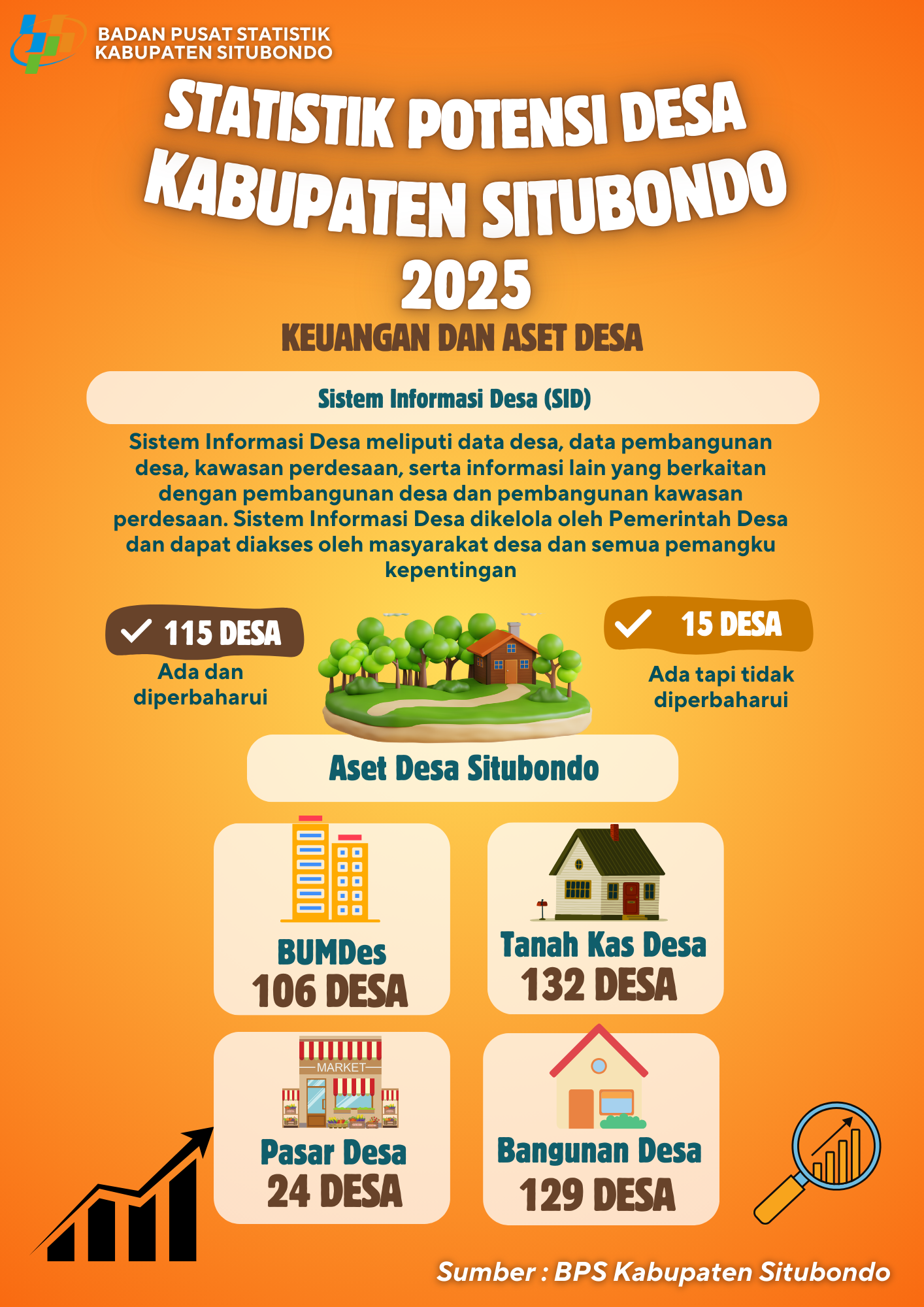Statistik Potensi Desa Kabupaten Situbondo 2025 pada aspek keuangan dan aset desa. Ditampilkan informasi tentang Sistem Informasi Desa (SID), di mana 115 desa telah memperbarui...