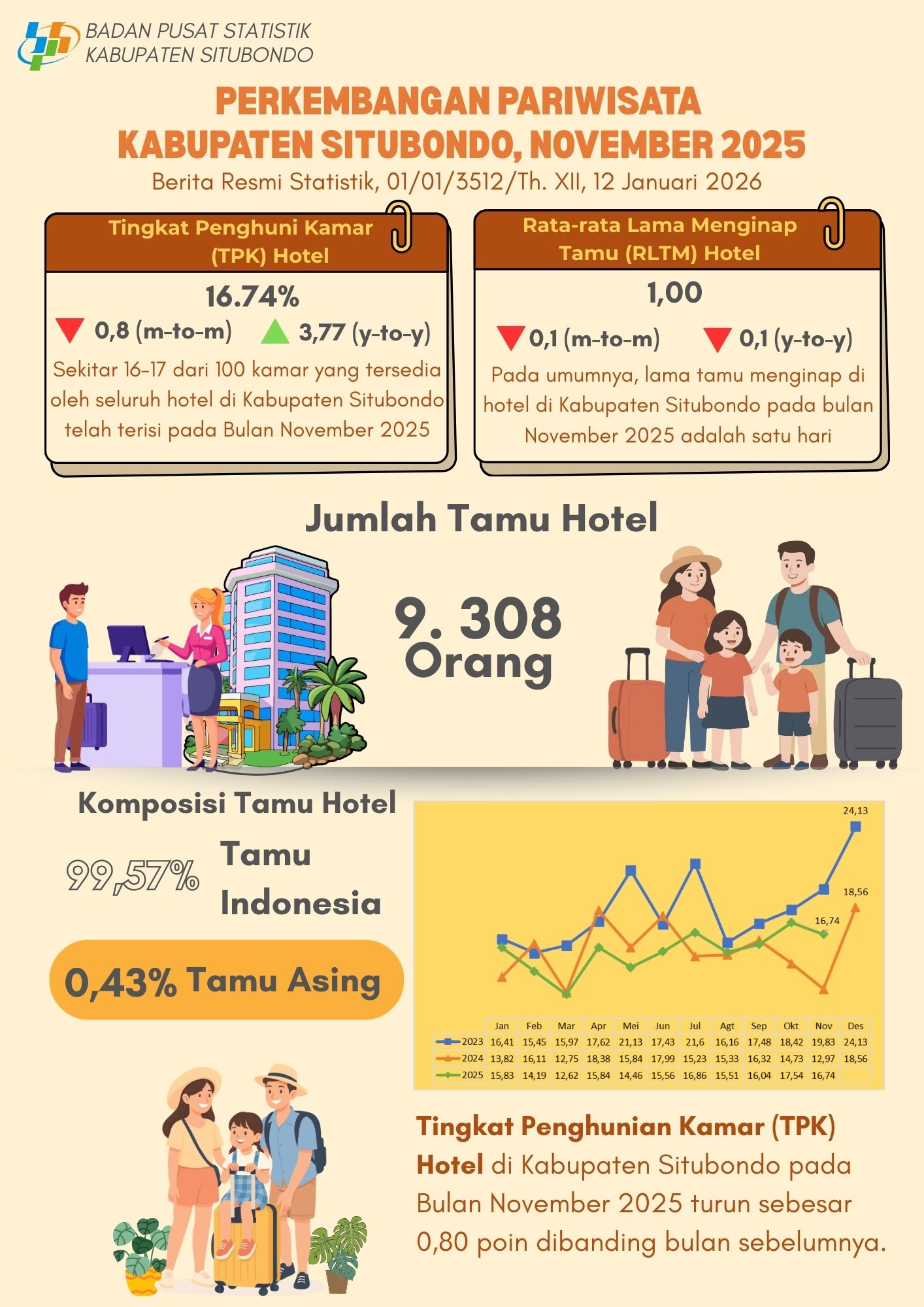 perkembangan pariwisata Kabupaten Situbondo pada November 2025 berdasarkan data BPS. Tingkat Penghunian Kamar (TPK) hotel tercatat 16,74%, dengan rata-rata lama menginap tamu 1 hari. Jumlah...