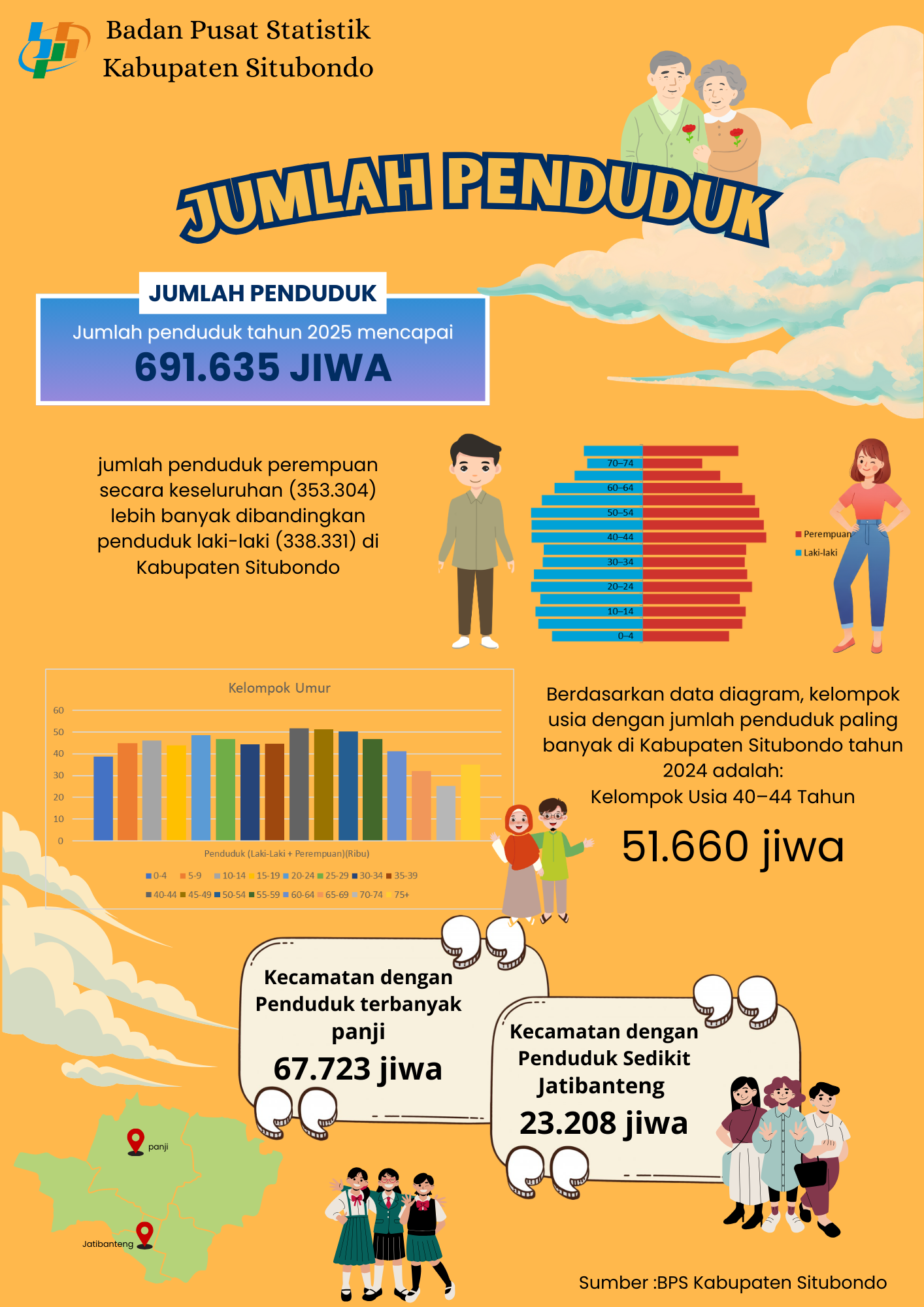 Berdasarkan data BPS Kabupaten Situbondo, jumlah penduduk pada tahun 2025 tercatat mencapai 691.635 jiwa, dengan komposisi penduduk perempuan (353.304 jiwa) yang lebih banyak dibandingkan laki-laki...