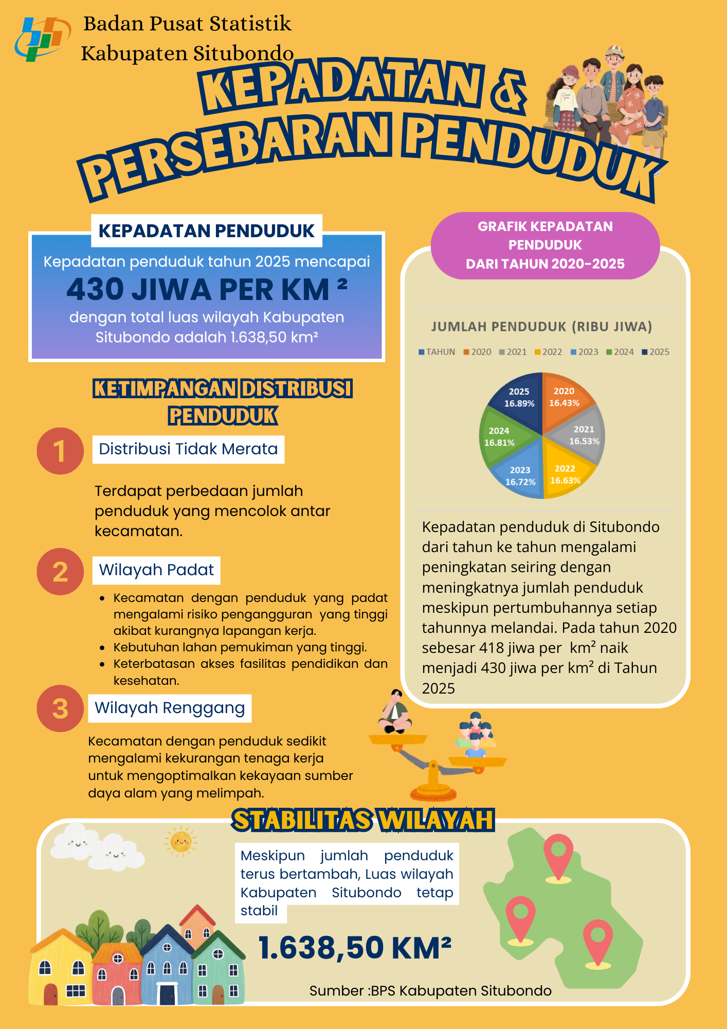 Infografis ini menggambarkan kepadatan dan persebaran penduduk Kabupaten Situbondo periode 2020–2025. Kepadatan penduduk meningkat hingga 430 jiwa per km² pada 2025, seiring pertumbuhan jumlah penduduk....