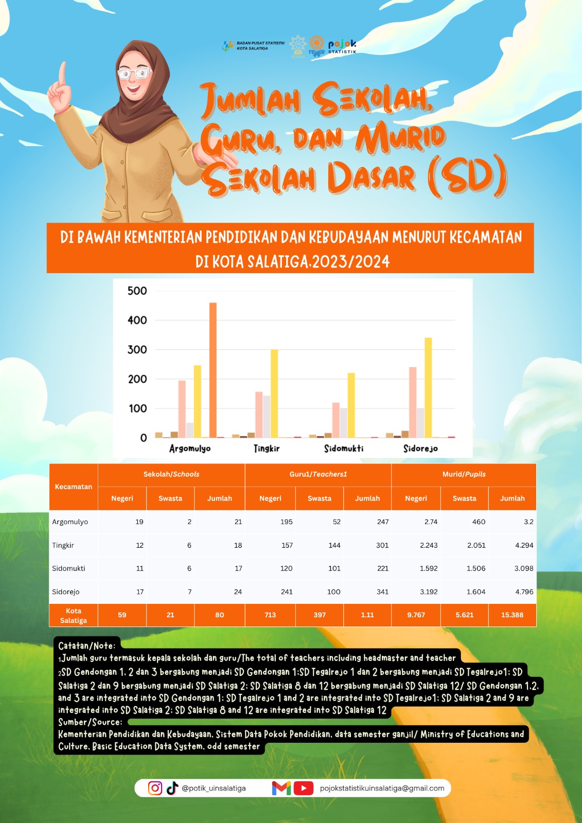 JUMLAH SEKOLAH GURU, DAN MURID SEKOLAH DASAR (SD) DI BAWAH KEMENTERIAN PENDIDIKAN DAN KEBUDAYAAN MENURUT KECAMATAN DI KOTA SALATIGA.2023/2024