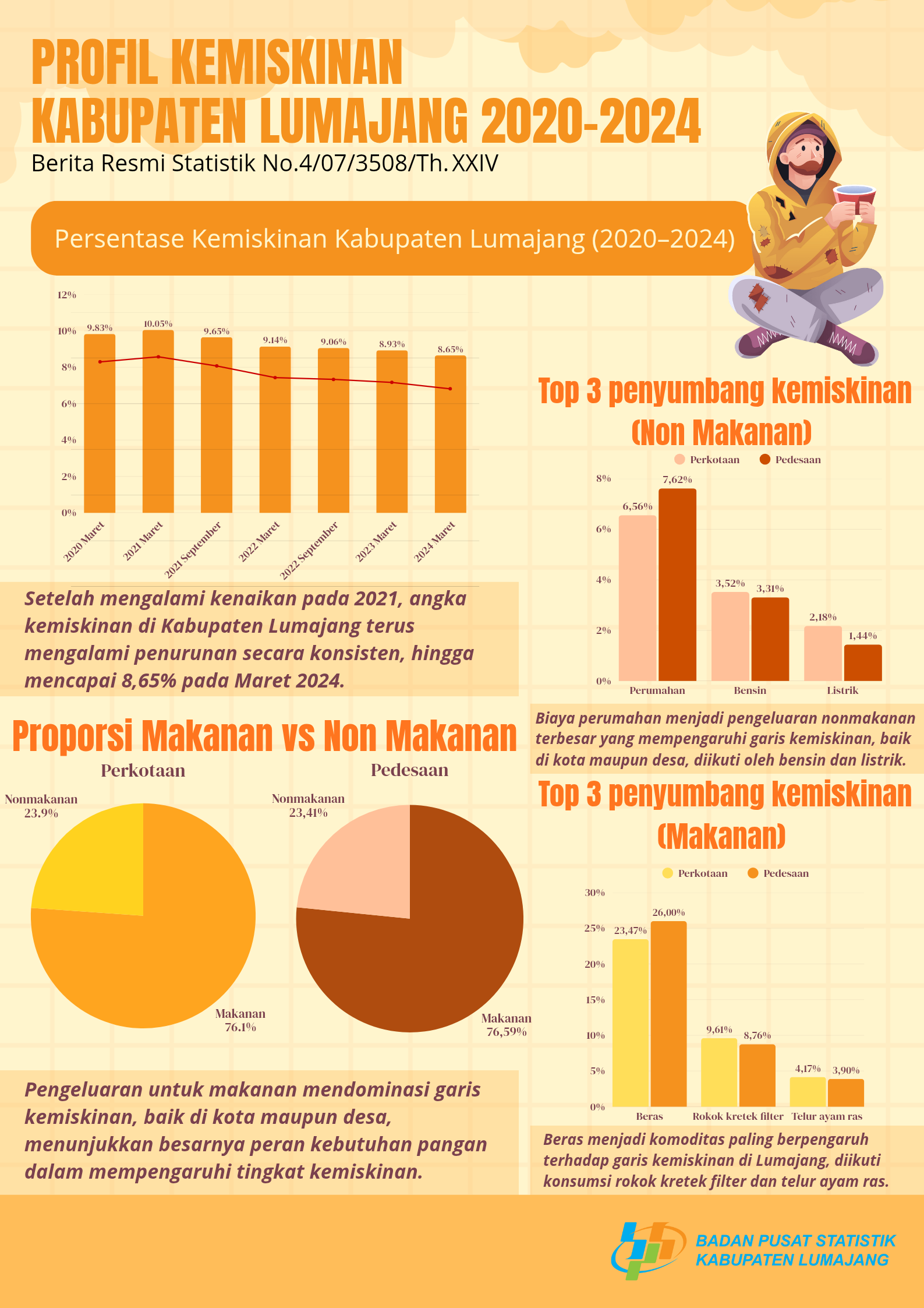 Infografis ini berisi tentang Profil Kemiskinan Kabupaten Lumajang Tahun 2020-2024 beserta 3 Penyumbang Kemiskinan Baik Makanan maupun Non Makanan