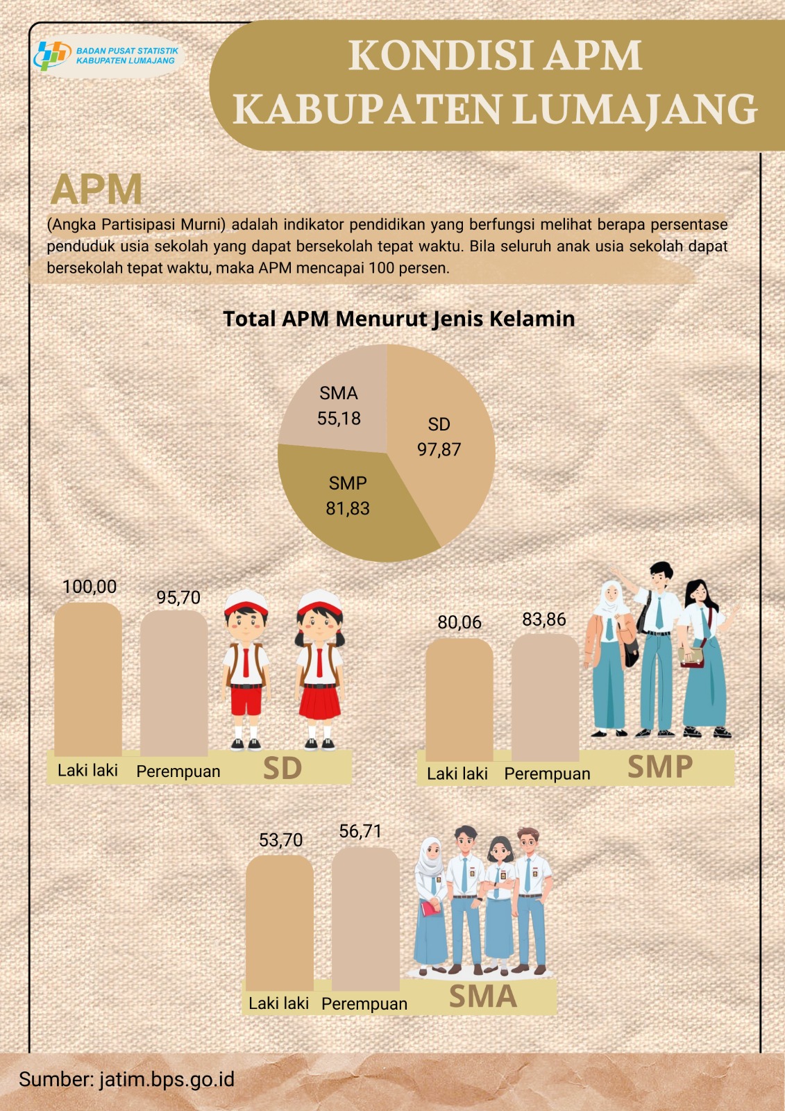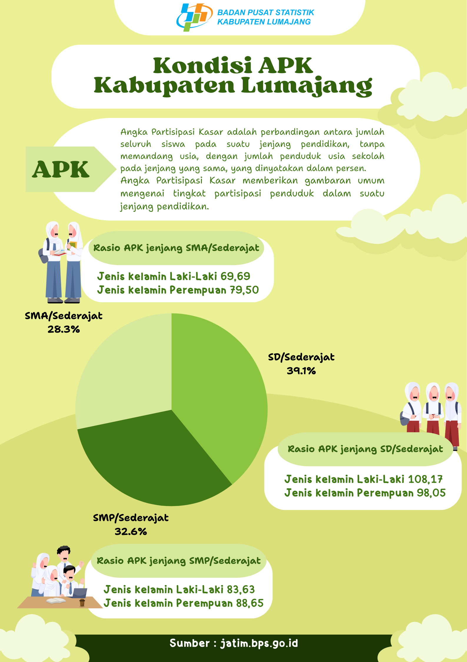 Infografis ini berisi tentang Kondisi APK Kabupaten Lumajang, dan Rasio APK untuk jenjang pendidikan SD/sederajat, SMP/sederajat, dan SMA/sederajat