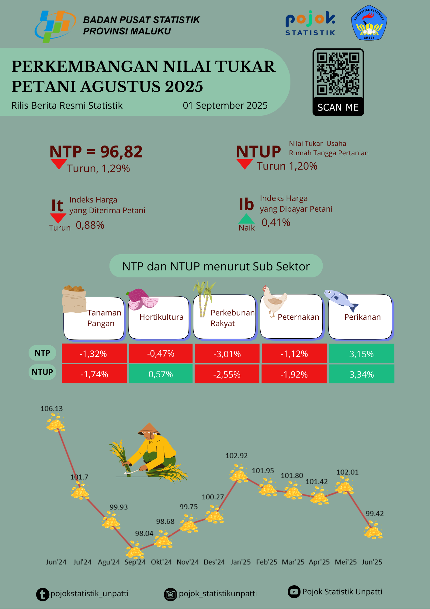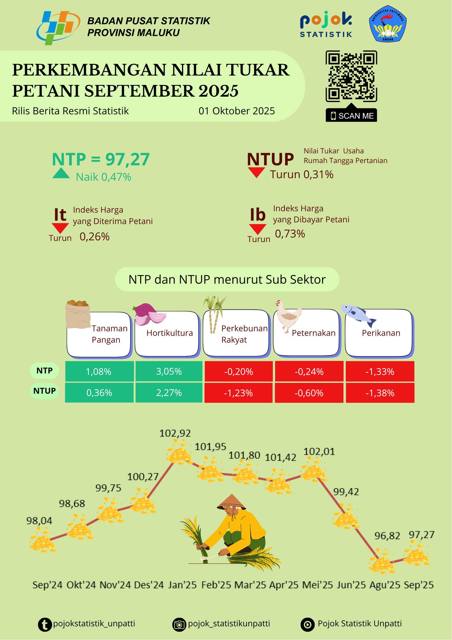 Nilai Tukar Petani (NTP) Provinsi Maluku pada September 2025 sebesar 97,27 atau naik 0,47 persen dibanding Agustus 2025 yang tercatat sebesar 96,82. Peningkatan NTP disebabkan...