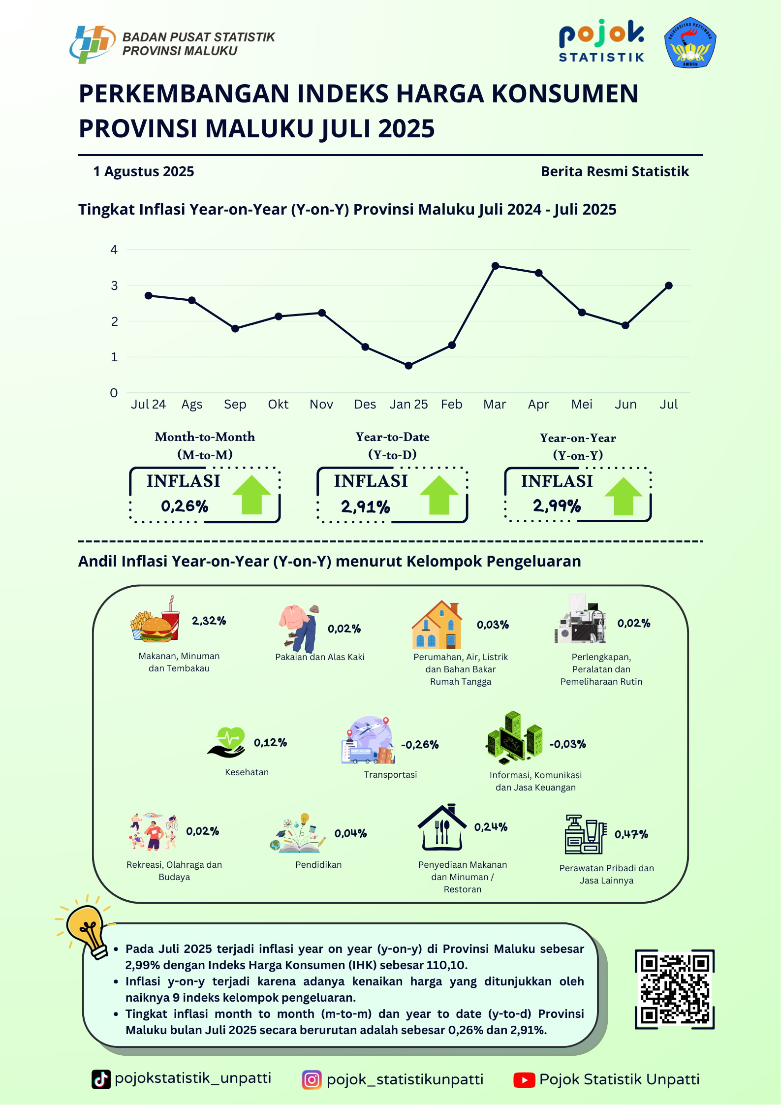 Pada Juli 2025 terjadi inflasi year on year (y-on-y) di Provinsi Maluku sebesar 2,99% dengan Indeks Harga Konsumen (IHK) sebesar 110,10. Inflasi y-on-y terjadi karena...
