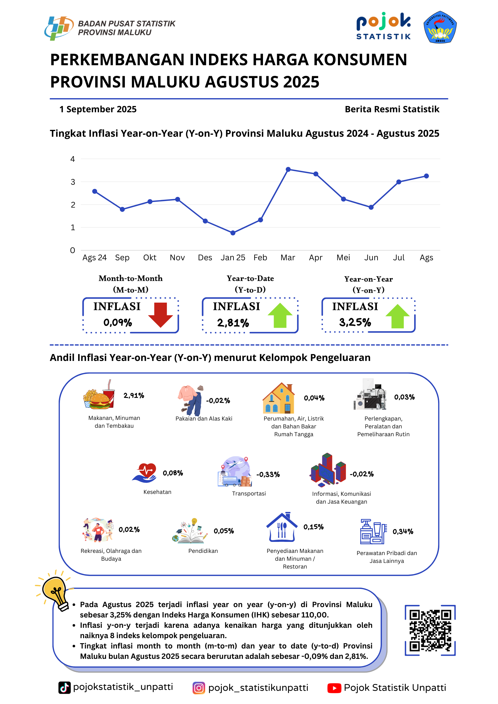 Pada Agustus 2025 terjadi inflasi year on year (y-on-y) di Provinsi Maluku sebesar 3,25% dengan Indeks Harga Konsumen (IHK) sebesar 110,00. Inflasi y-on-y terjadi karena...