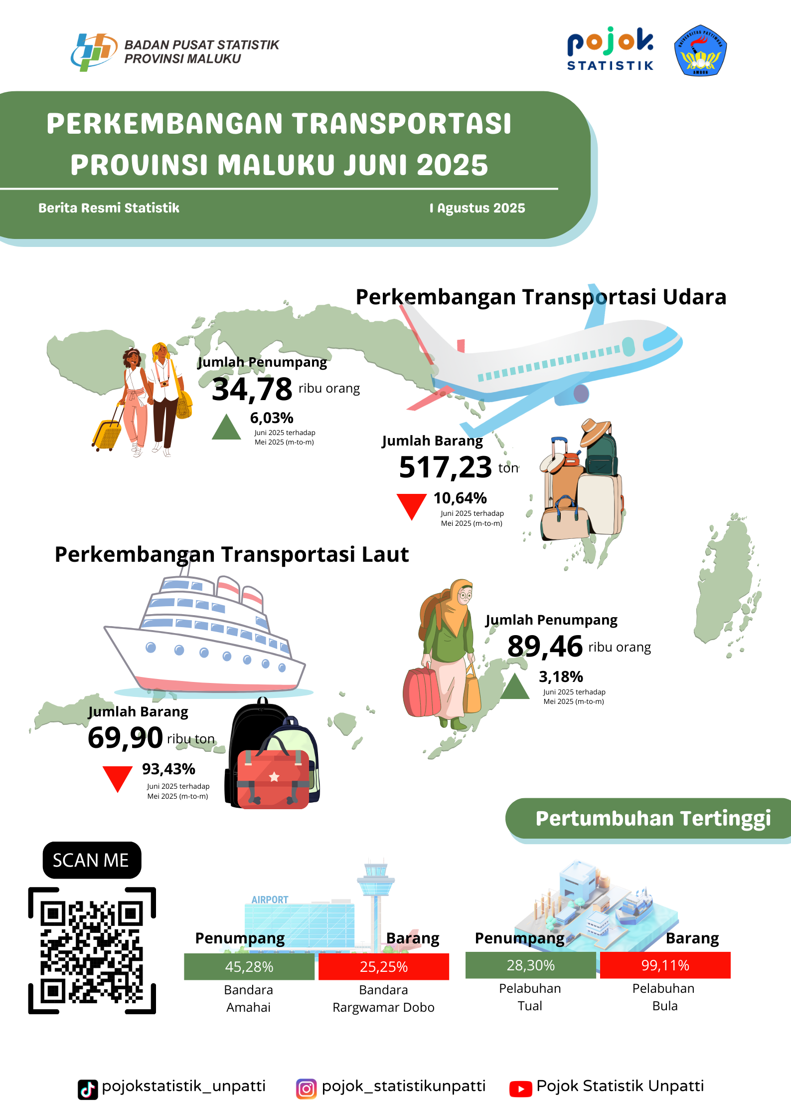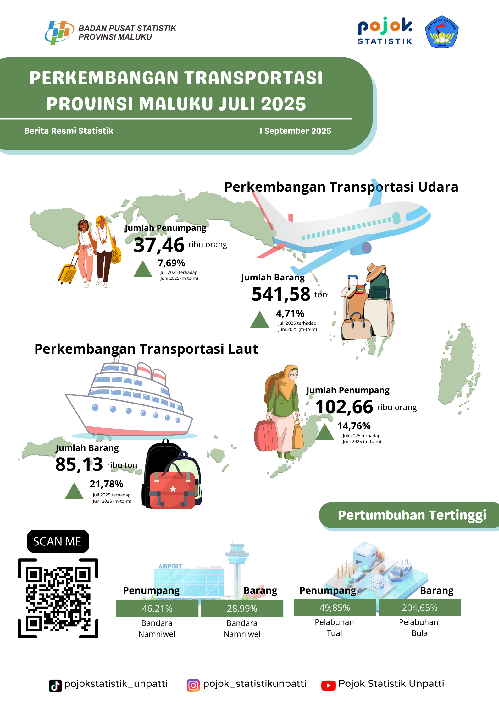 Pada Juli 2025, perkembangan transportasi di Provinsi Maluku menunjukkan peningkatan baik pada angkutan udara maupun laut. Jumlah penumpang udara tercatat sebanyak 37,46 ribu orang atau...