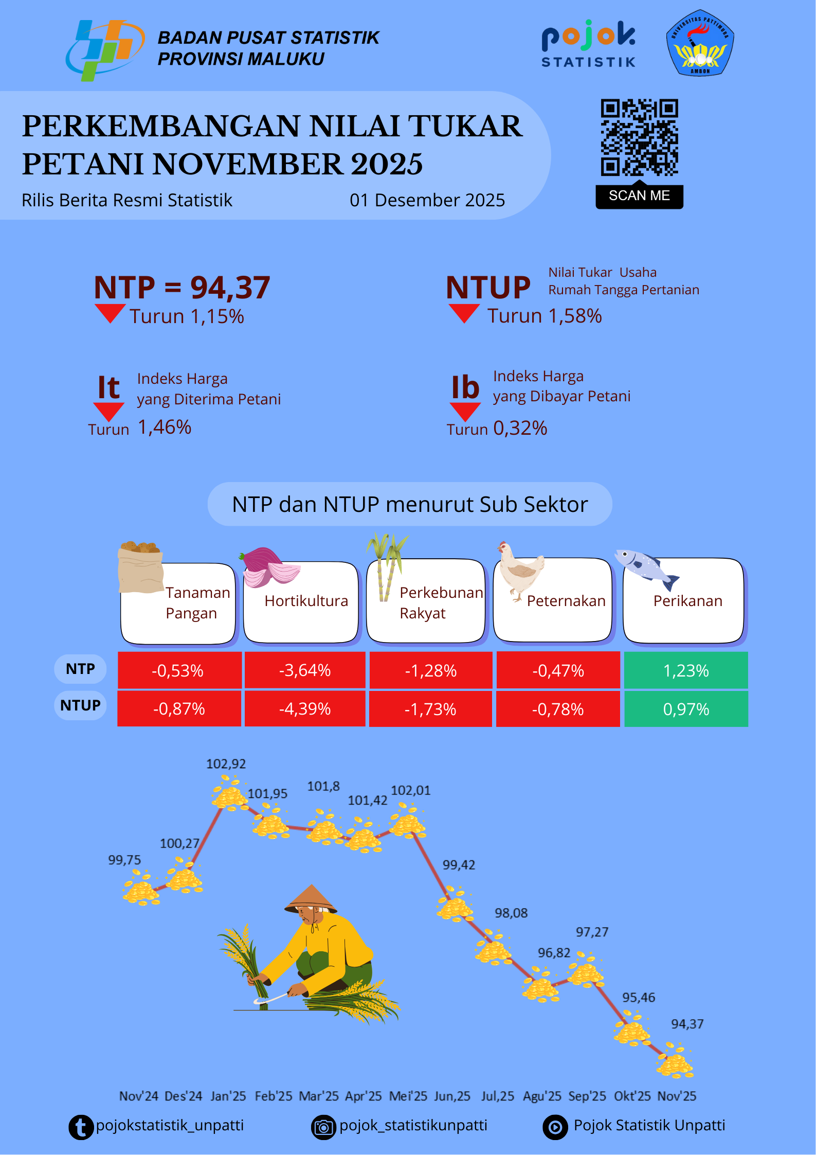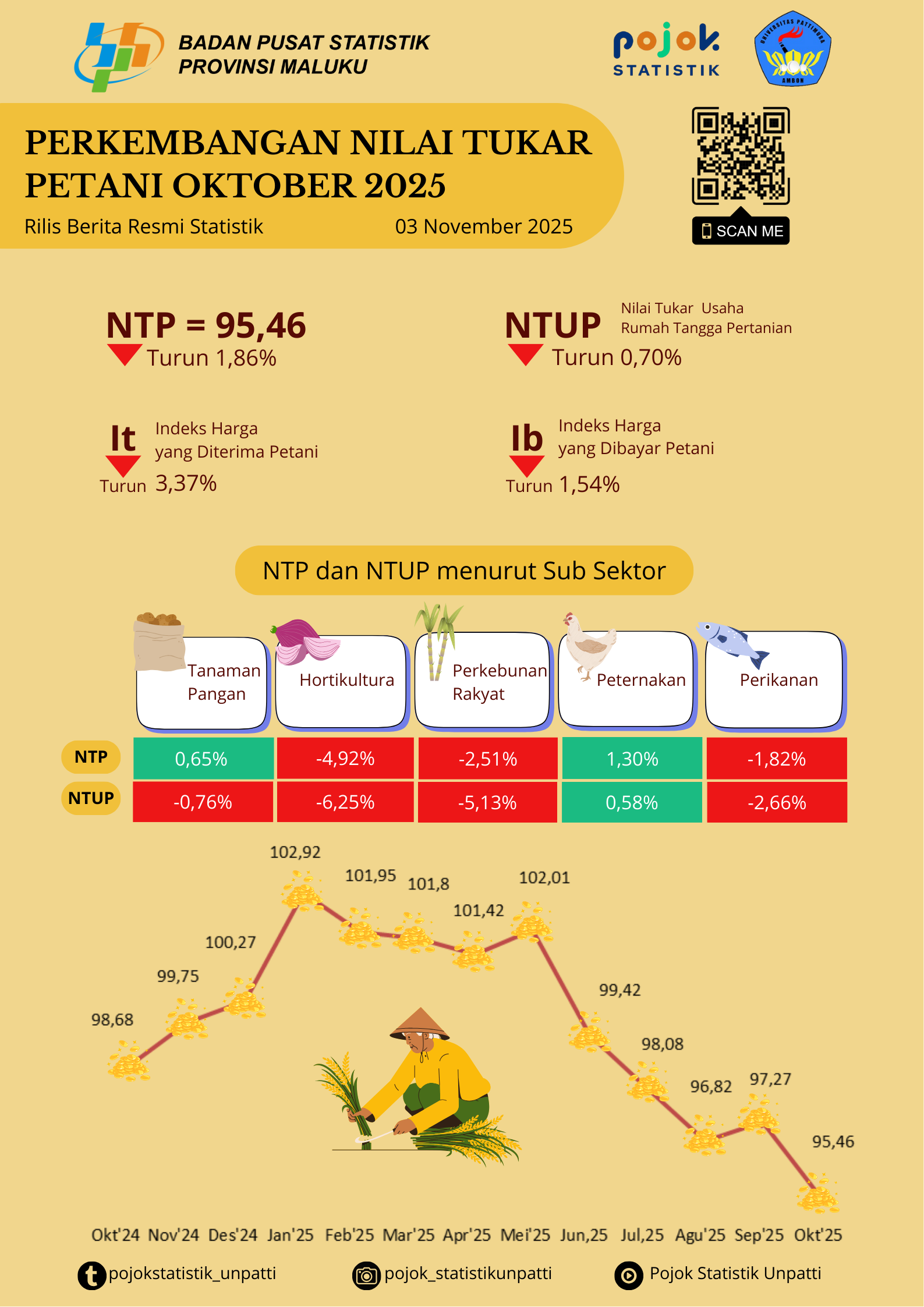 Nilai Tukar Petani (NTP) Provinsi Maluku pada Oktober 2025 sebesar 95,46 atau turun 1,86 persen dibanding September 2025 yang tercatat sebesar 97,27. Penurunan NTP disebabkan...