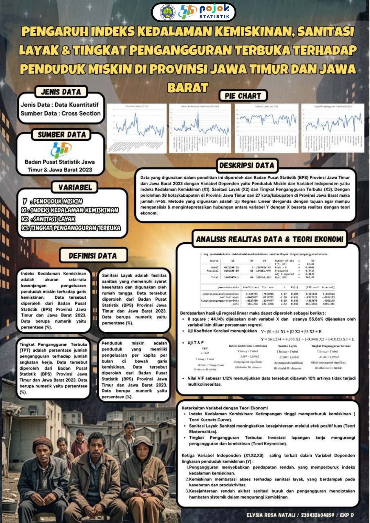 Infografis ini membahas pengaruh Indeks Kedalaman Kemiskinan, Sanitasi Layak, dan Tingkat Pengangguran Terbuka terhadap jumlah Penduduk Miskin di Provinsi Jawa Timur dan Jawa Barat.