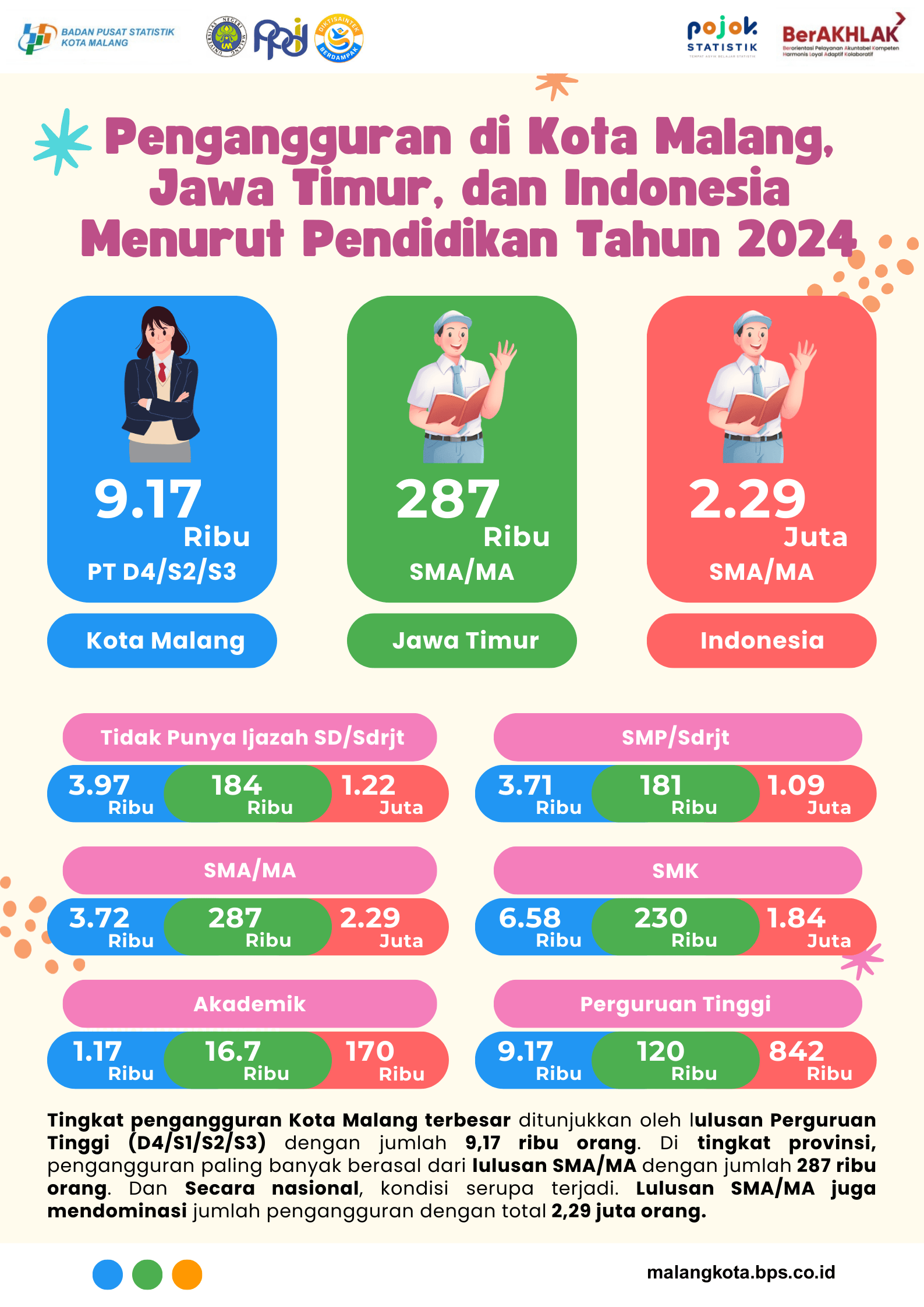 Data terkait jumlah pengangguran di Kota Malang, Jawa Timur, dan Indonesia menurut Pendidikan Tahun 2024