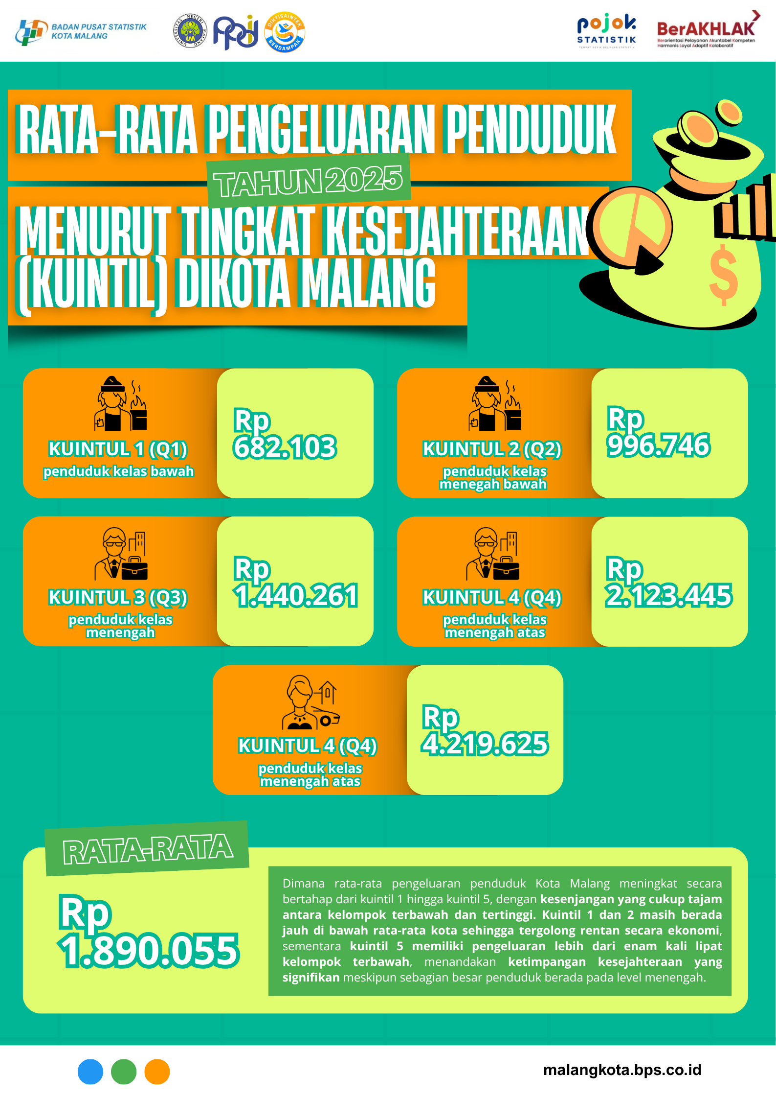 Infografis ini menyajikan gambaran rata-rata pengeluaran penduduk Kota Malang tahun 2023 berdasarkan lima kuintil kesejahteraan. Visualisasi menunjukkan bagaimana kemampuan pengeluaran meningkat seiring naiknya tingkat kesejahteraan,...