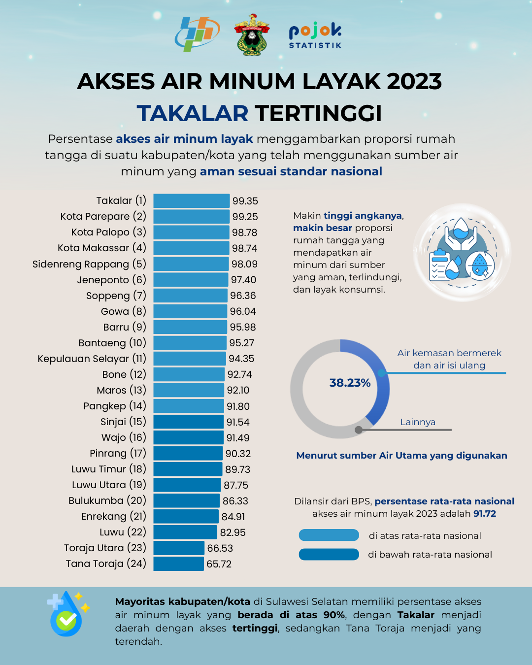 Persentase akses air minum layak menggambarkan proporsi rumah tangga di suatu Kabupaten/Kota yang telah menggunakan sumber air minum yang aman sesuai standar nasional
