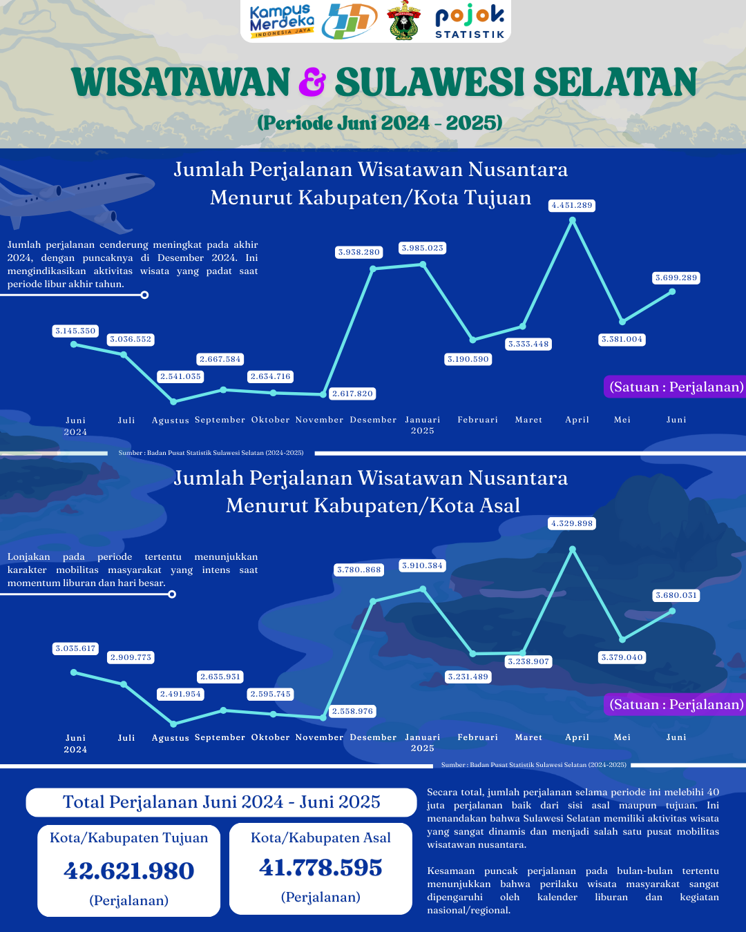 Infografis ini menyajikan perkembangan jumlah perjalanan wisatawan nusantara di Sulawesi Selatan selama periode Juni 2024 – Juni 2025, baik berdasarkan kabupaten/kota tujuan maupun kabupaten/kota asal....