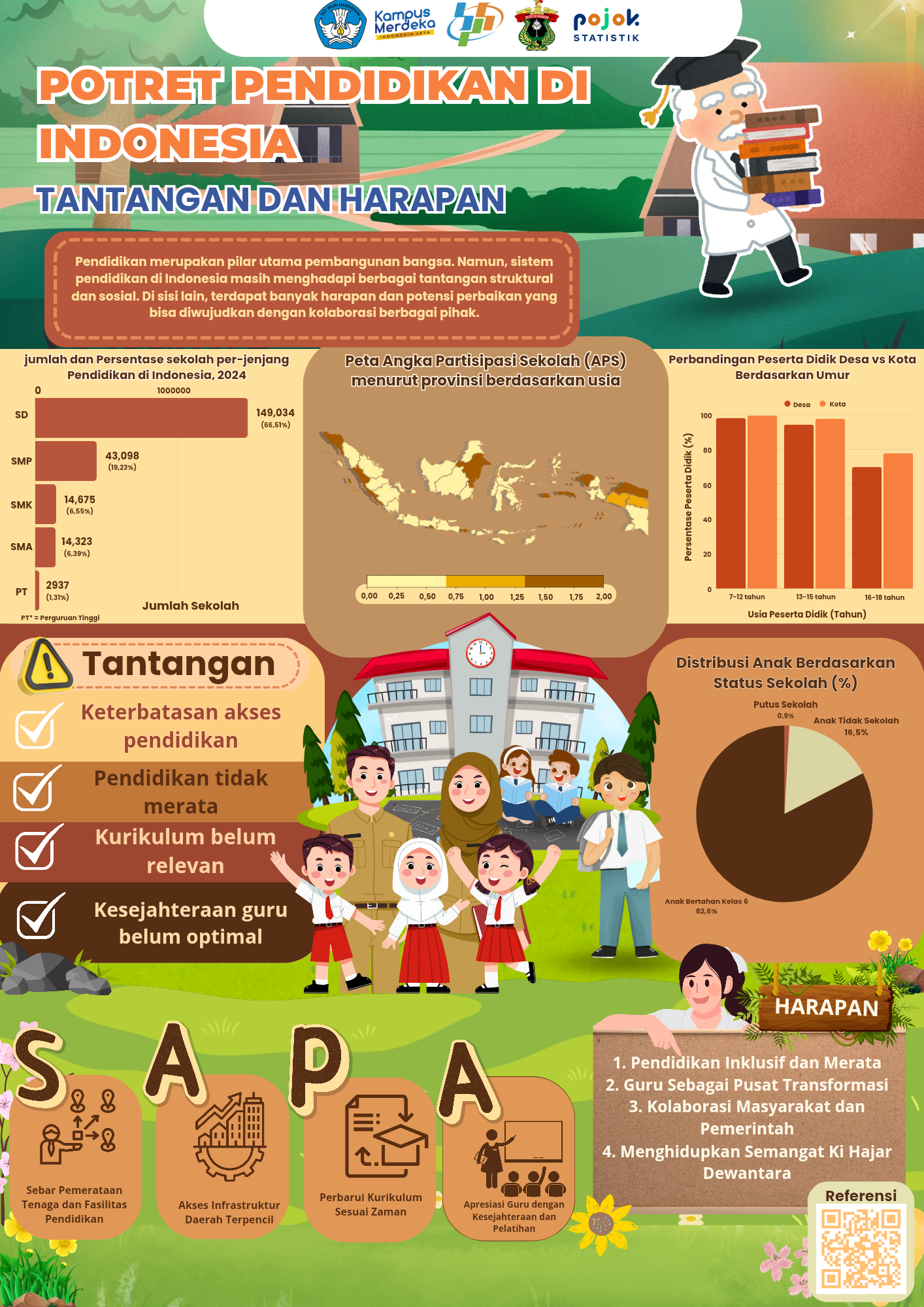 Infografis ini merangkum tantangan dan harapan pendidikan di Indonesia. Tantangannya mencakup akses, pemerataan, kurikulum, dan kesejahteraan guru. Harapannya adalah mewujudkan pendidikan inklusif, meningkatkan peran guru,...
