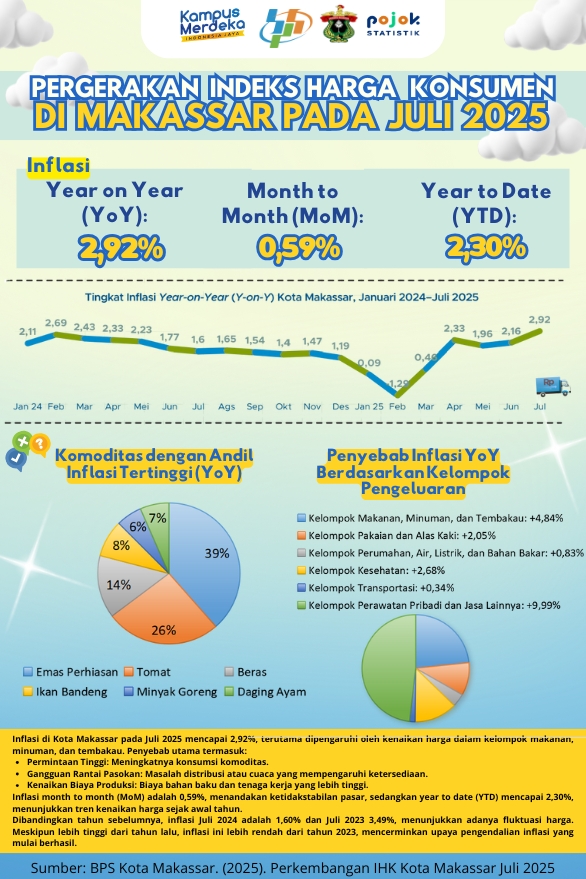 Infografis ini menunjukkan pergerakan Indeks Harga Konsumen (IHK) di Makassar pada Juli 2025 dengan inflasi YoY sebesar 2,92%, MoM 0,59%, dan YTD 2,30%. Komoditas penyumbang...