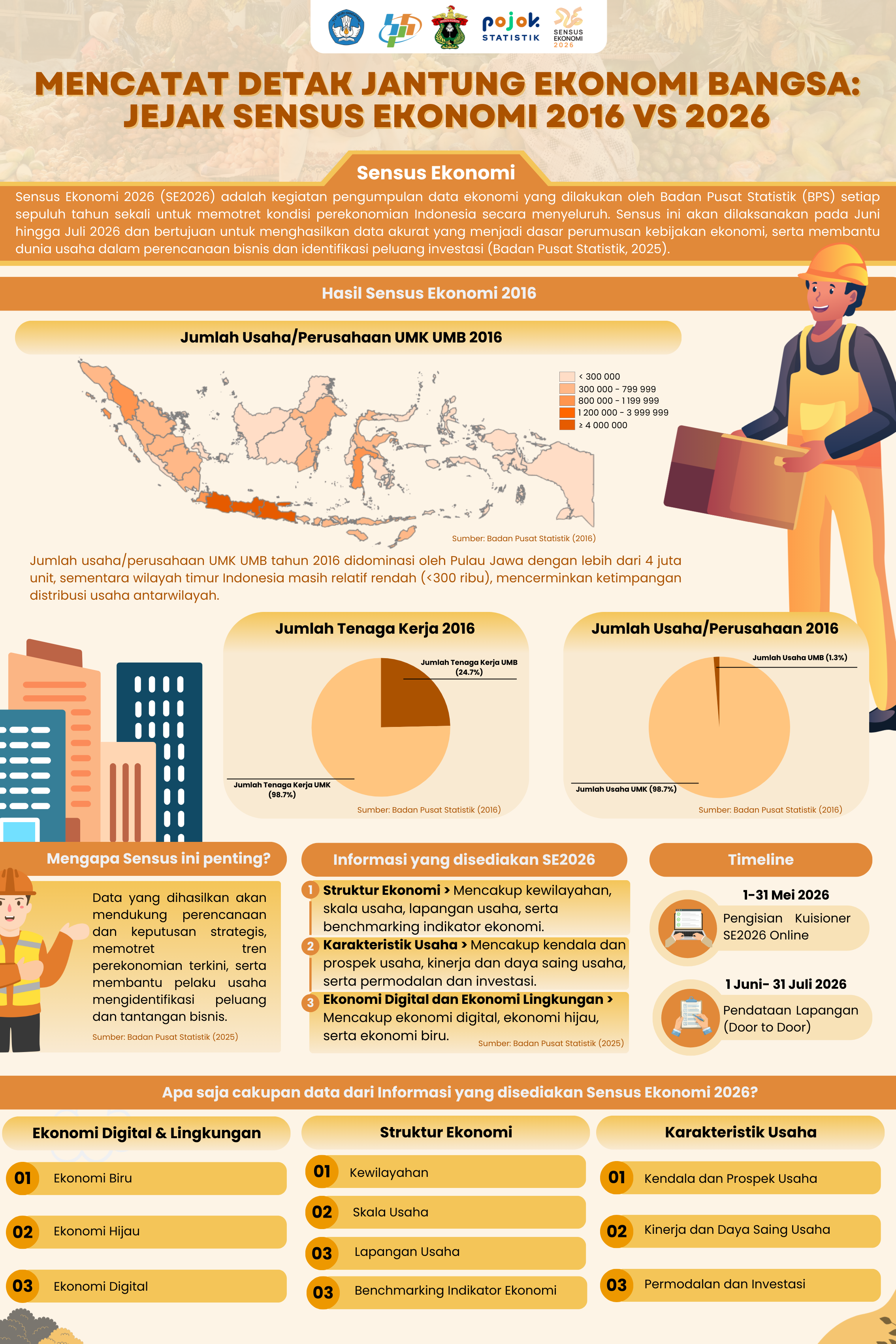 Sensus Ekonomi 2026 (SE2026) adalah upaya Badan Pusat Statistik (BPS) dalam mencatat kondisi perekonomian Indonesia secara menyeluruh setiap sepuluh tahun. Dari hasil kilas balik hasil...