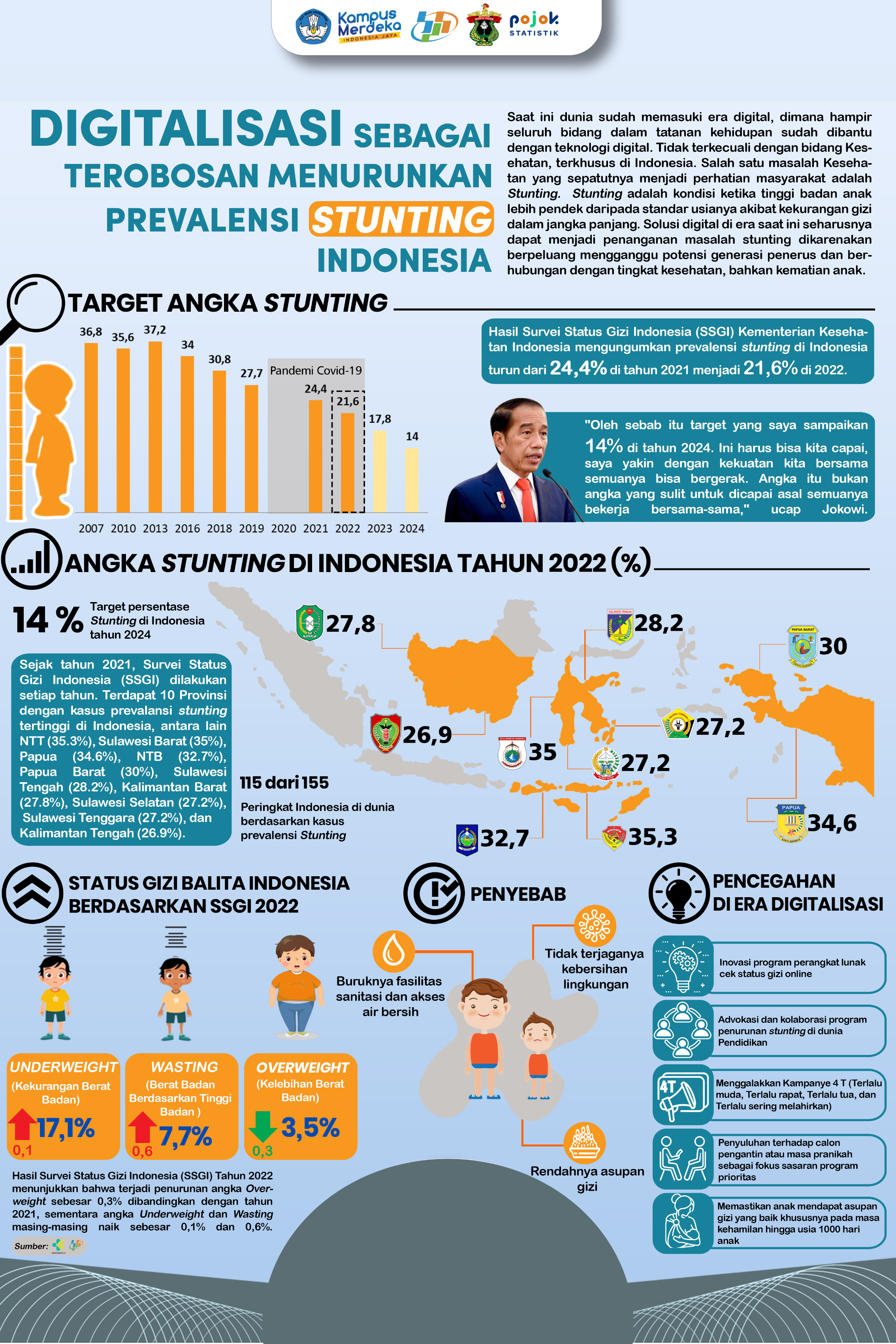 Stunting adalah kondisi ketika tinggi badan anak lebih pendek daripada standar usianya akibat kekurangan asupan gizi sejak masa kehamilan. Sejak tahun 2021, Survei Status Gizi...