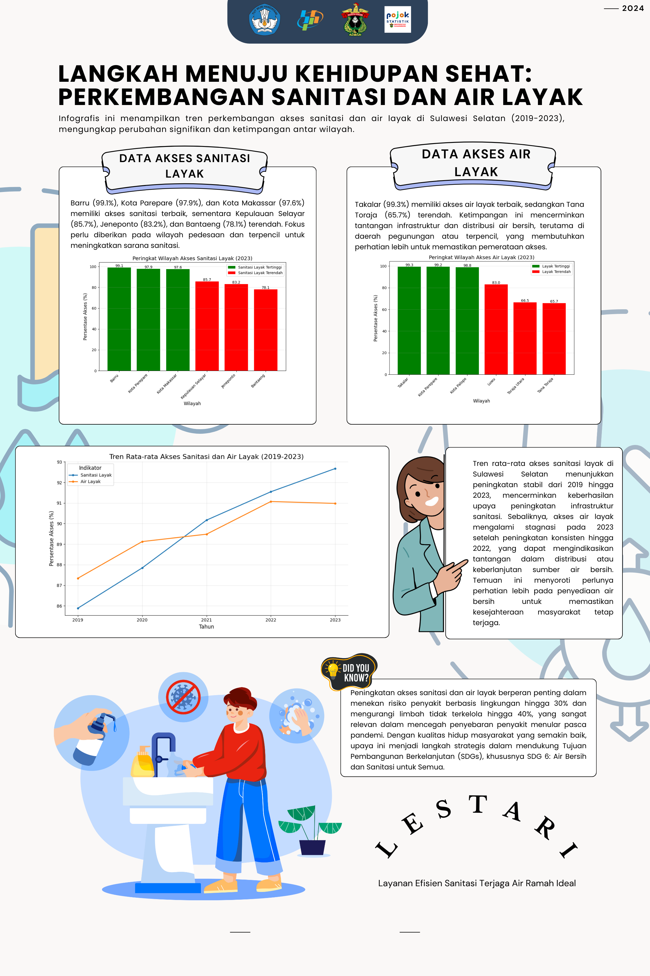 Infografis berjudul "Lima Sila Satu Suara: Menelusuri Jejak Pancasila dalam Denyut Data Sulsel" menampilkan implementasi nilai-nilai Pancasila di Sulawesi Selatan melalui data terkini. Ditunjukkan bahwa...