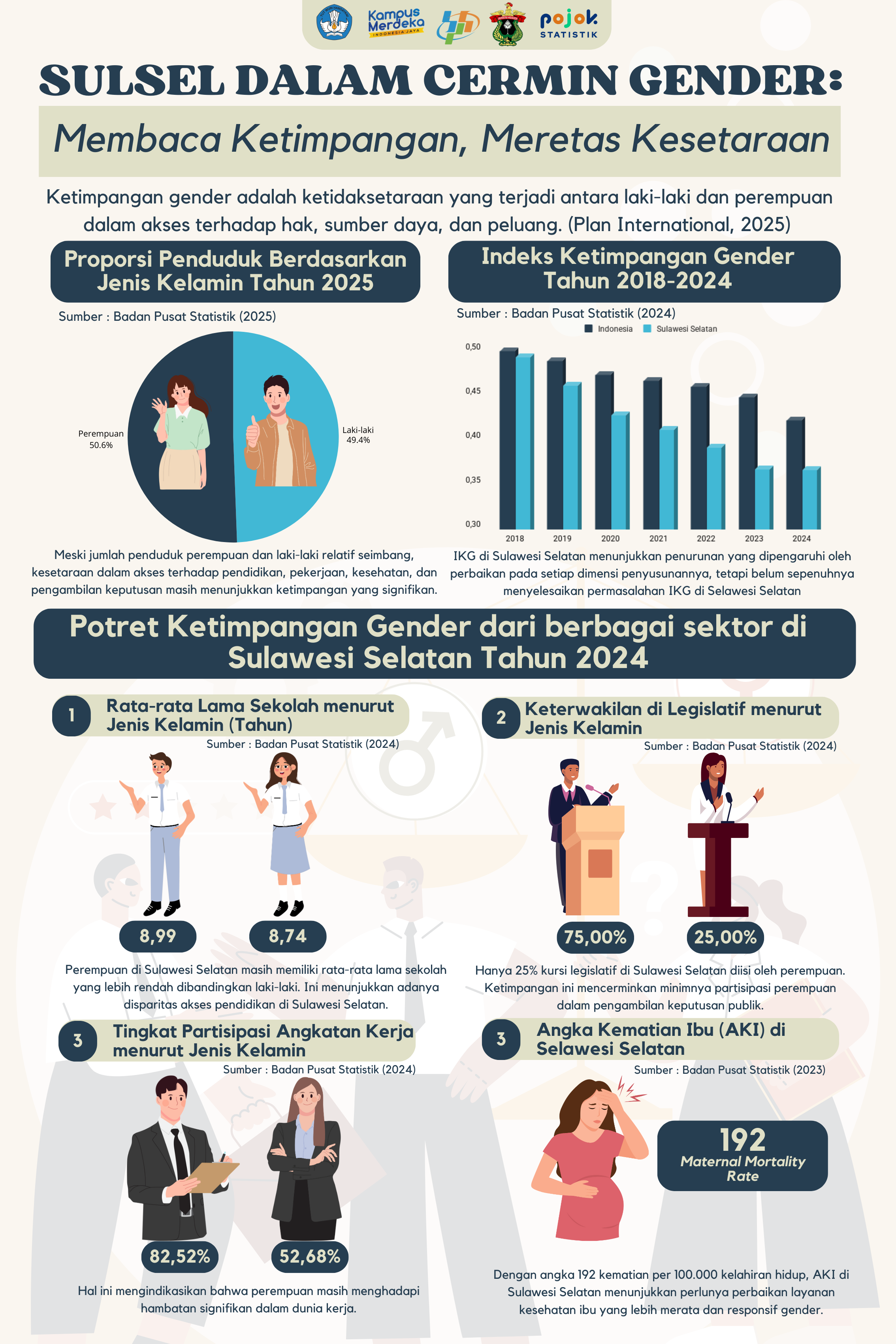 Infografis "Sulsel dalam Cermin Gender: Membaca Ketimpangan, Meretas Kesetaraan" menyajikan kondisi ketimpangan gender di Provinsi Sulawesi Selatan berdasarkan data terbaru dari Badan Pusat Statistik. Infografis...