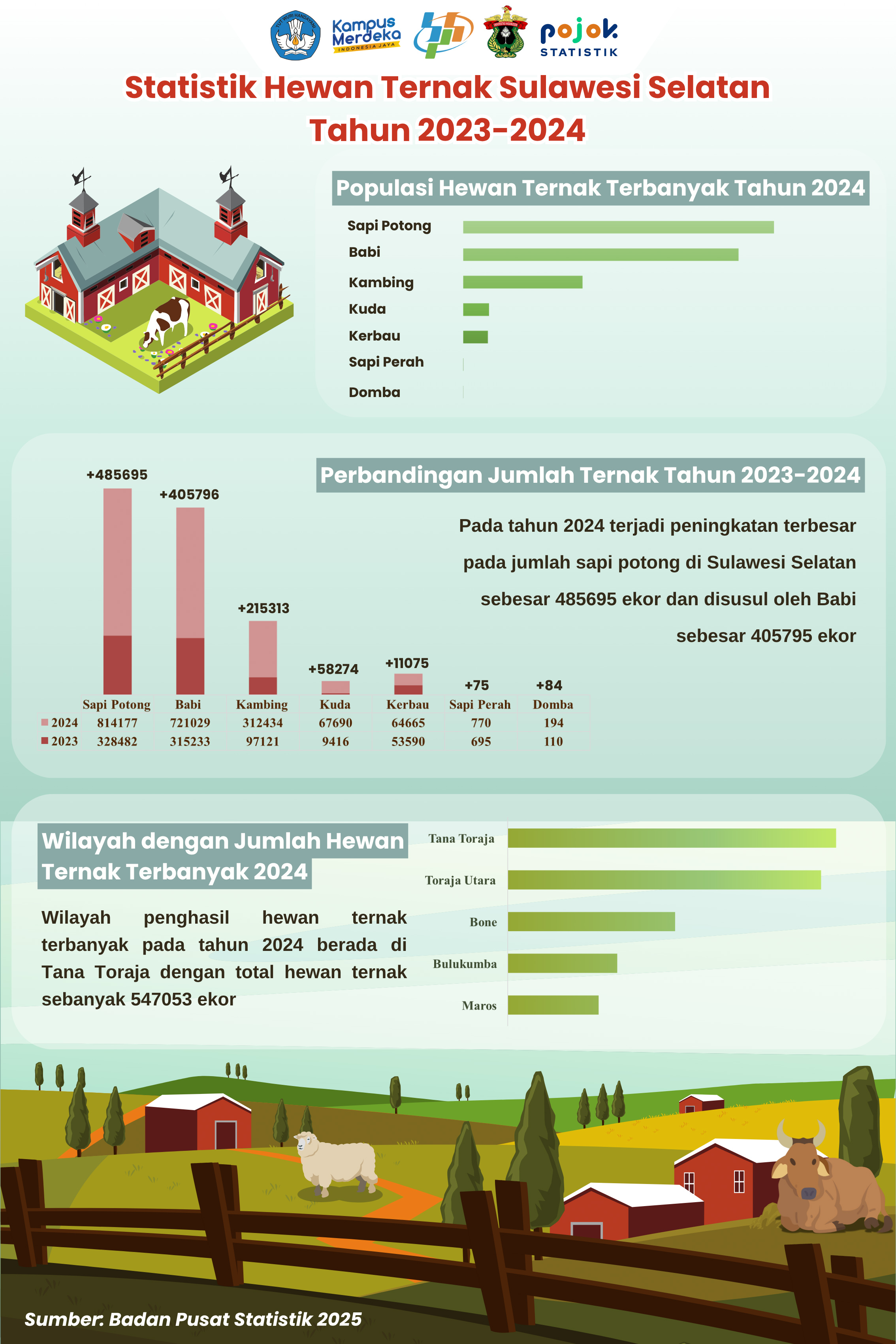 Infografis ini menyajikan perkembangan populasi hewan ternak di Sulawesi Selatan selama tahun 2023 hingga 2024. Data menunjukkan peningkatan signifikan pada jumlah sapi potong dan babi,...