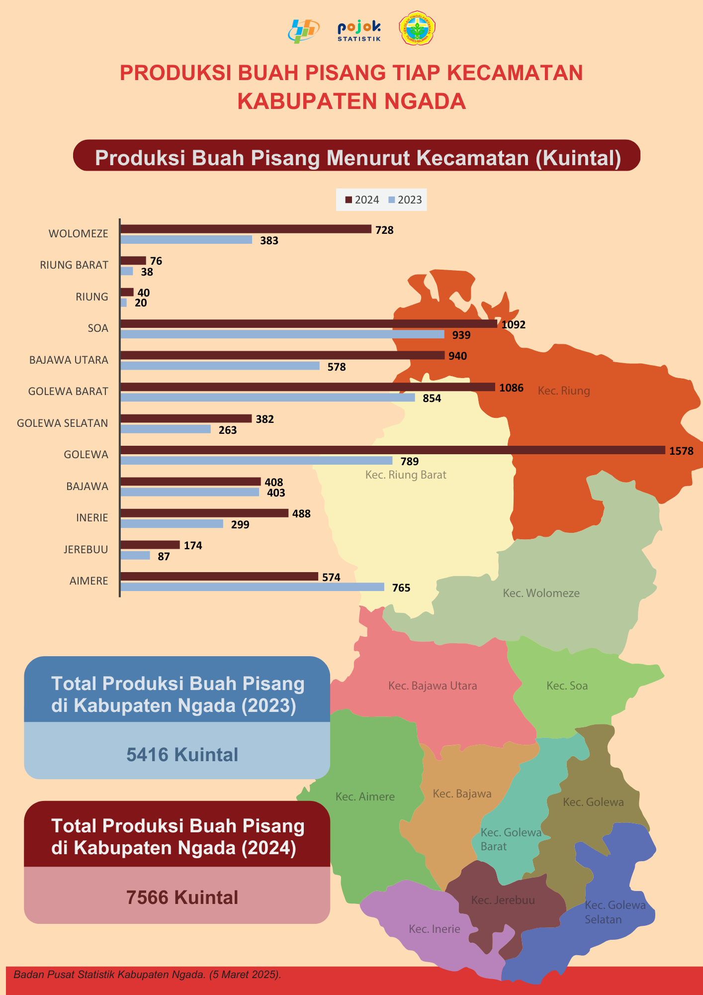 Produksi Buah Pisang Menurut Kecamatan (Kuintal) di Kabupaten Ngada