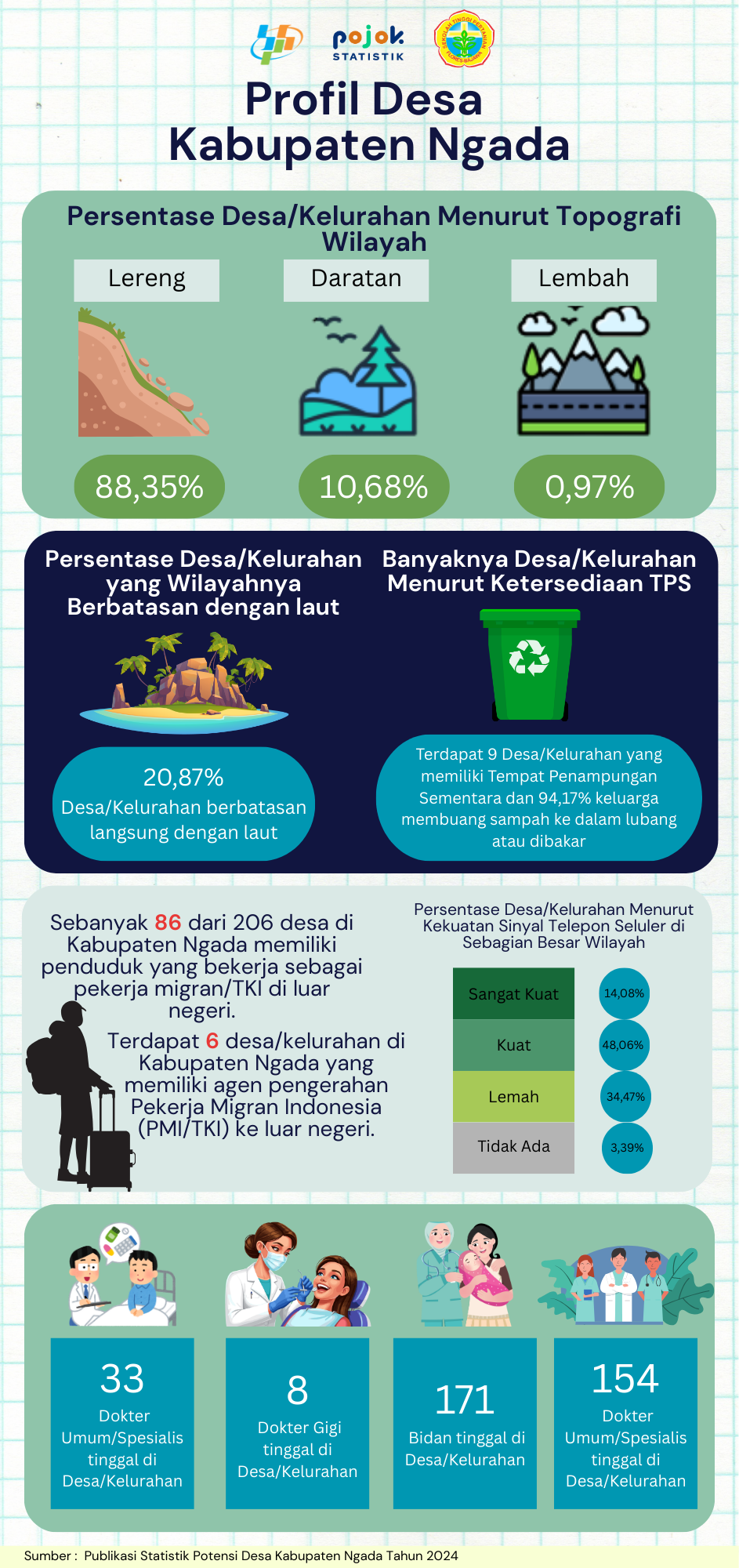 Desa/Kelurahan Menurut Topografi Wilayah, Ketersediaan TPS, Ketenagakerjaan, Kekuatan Sinyal, Tenaga Kesehatan