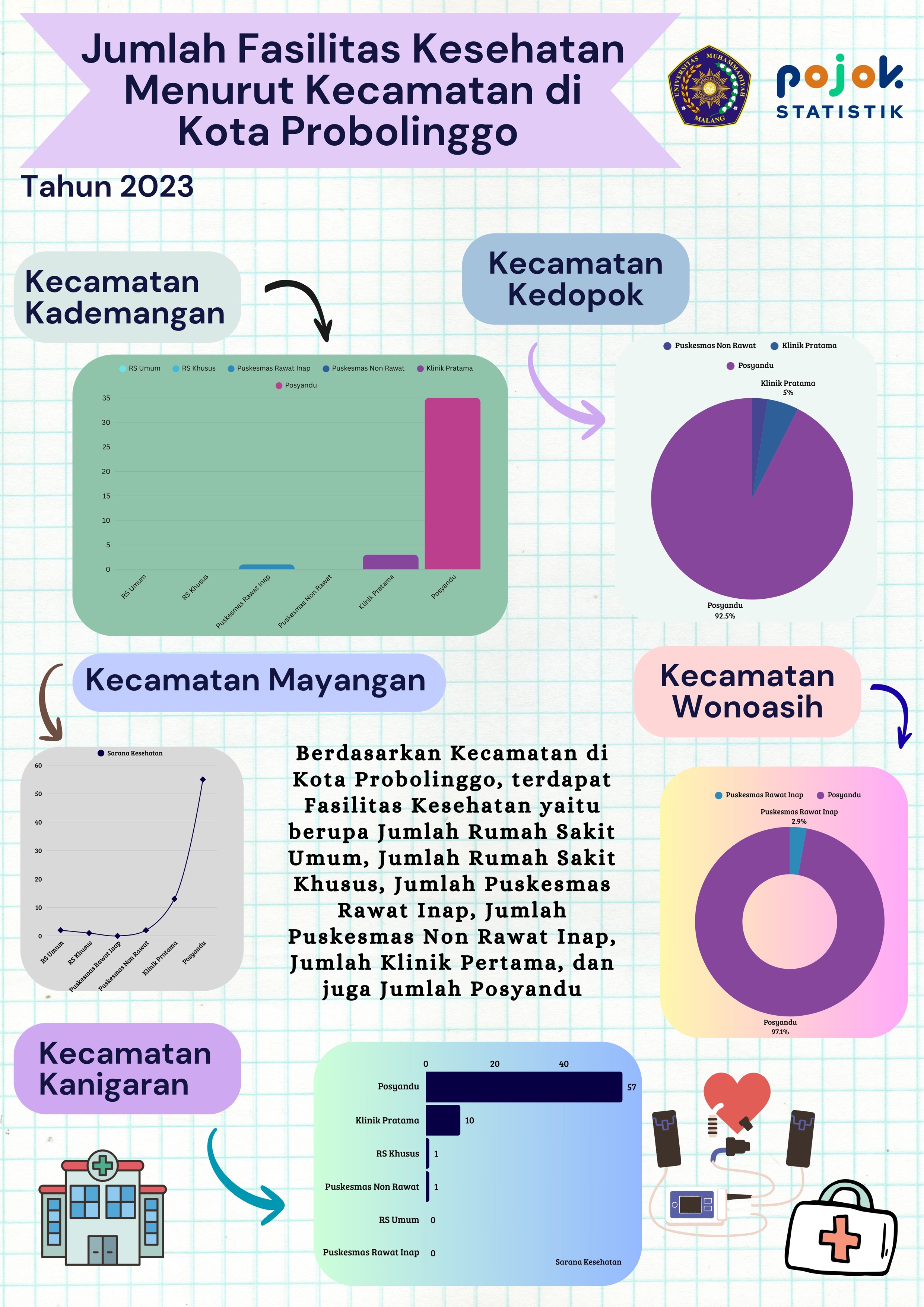 Berdasarkan kecamatan di Kota Probolinggo, terdapat fasilitas kesehatan yaitu berupa julah rumah sakit umum, jumlah rumah sakit khusus, jumlahpuskesmas rawat inap, jumlah puskesmas non rawat...