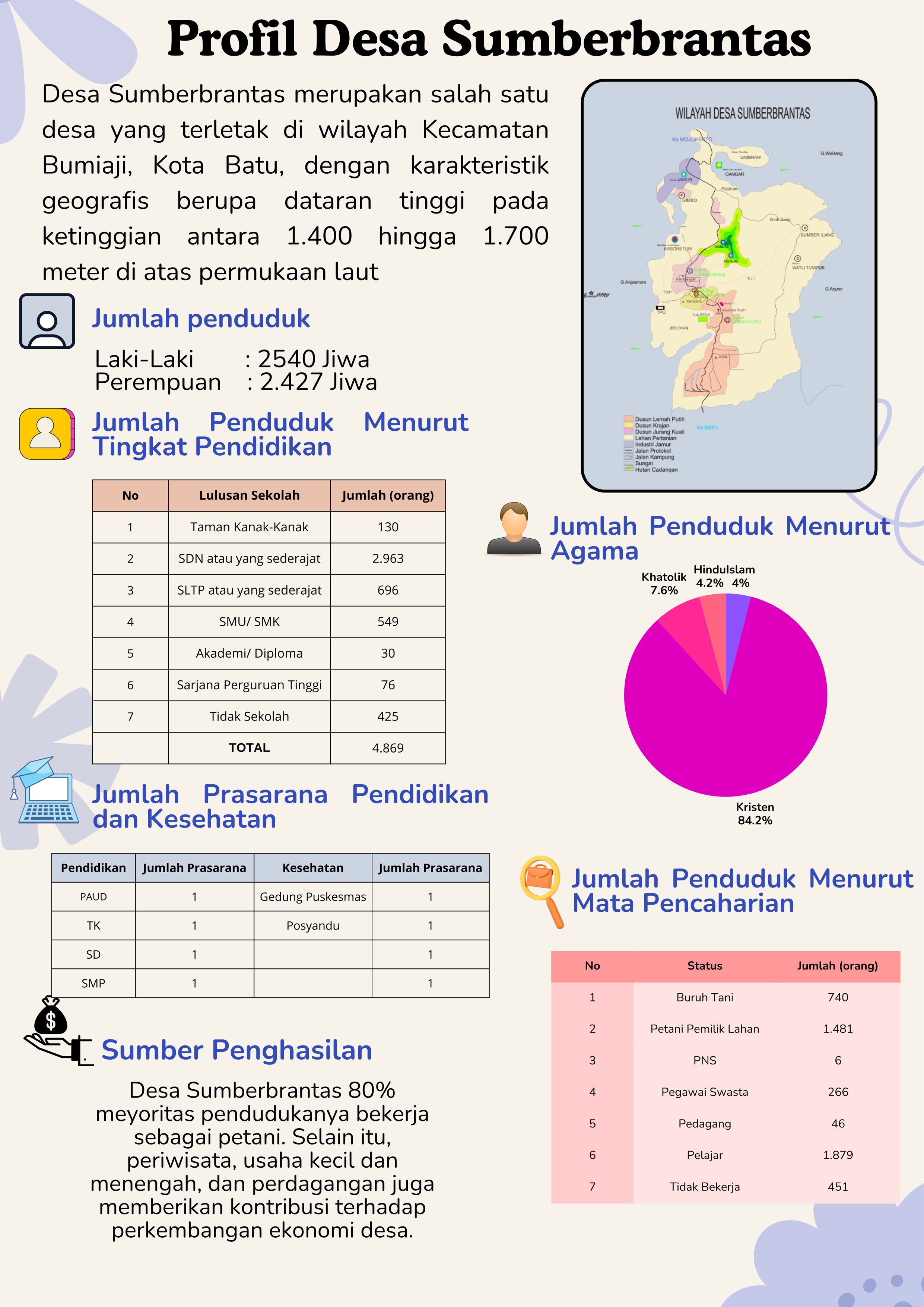 Desa Sumberbrantas merupakan salah sat udesa yang terletak di wilayah Kecamatan Bumiaji Kota Batu dengan karakteristik geografis berupa daratan tinggi pada ketinggian antara 1.400 hingga...