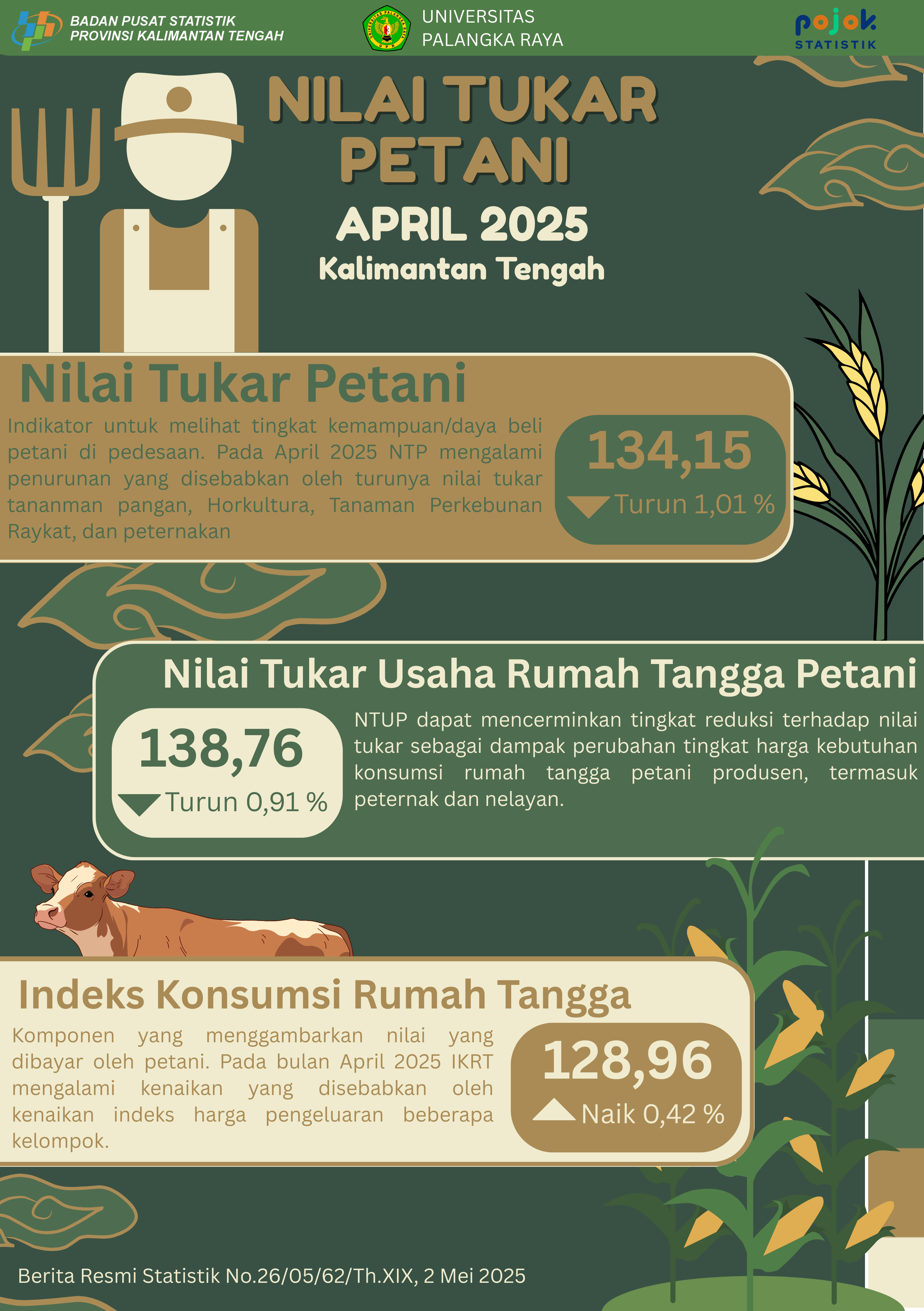 NTP Gabungan Kalimantan Tengah pada April 2025 turun sebesar 1,01 persen dibanding Maret 2025, yaitu dari 135,52 menjadi 134,15. Penurunan ini disebabkan oleh turunnya nilai...