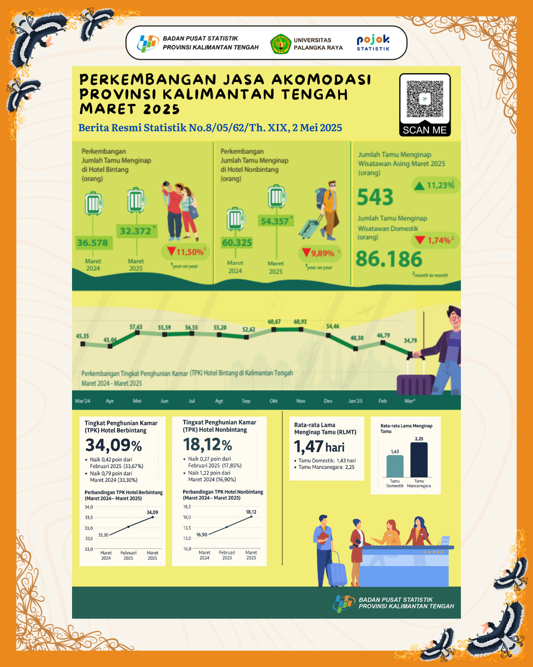 Publikasi BPS Provnsi Kalteng_Berita Resmi Statistik No.8/05/62/Th. XIX yang dirilis pada 2 Mei 2025. Data perkembangan jasa akomodasi Maret 2025, yang menunjukkan penurunan jumlah tamu...