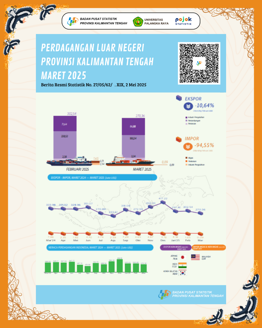 Infografis ini menyajikan data perdagangan luar negeri Provinsi Kalimantan Tengah pada Maret 2025. Data menunjukkan penurunan ekspor sebesar 10,64% dan penurunan impor yang signifikan sebesar...