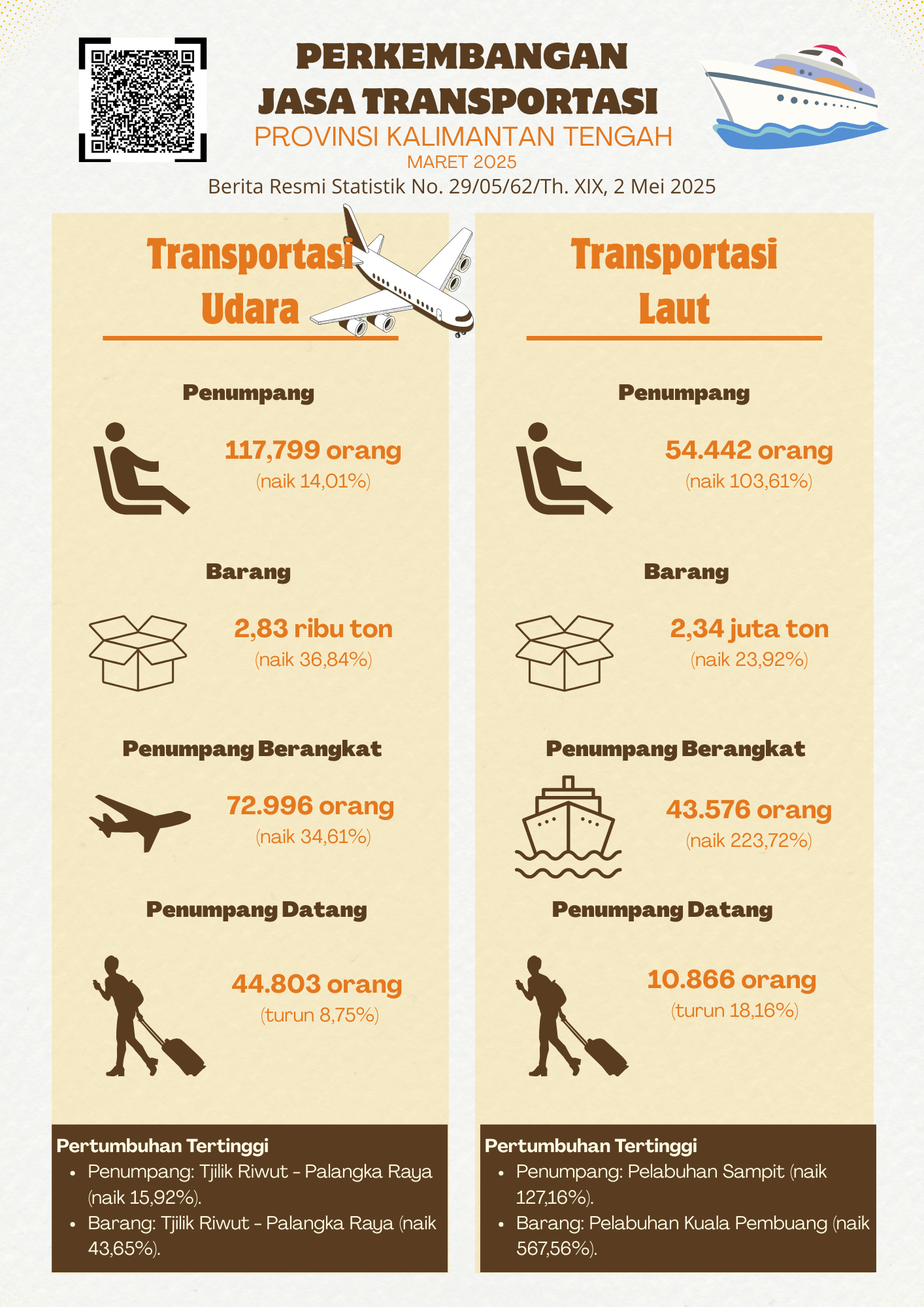 Pada Maret 2025, transportasi di Kalimantan Tengah menunjukkan peningkatan signifikan. Penumpang udara meningkat 14,01% (117.799 orang) dengan kargo naik 36,84% (2,83 ribu ton). Transportasi laut...