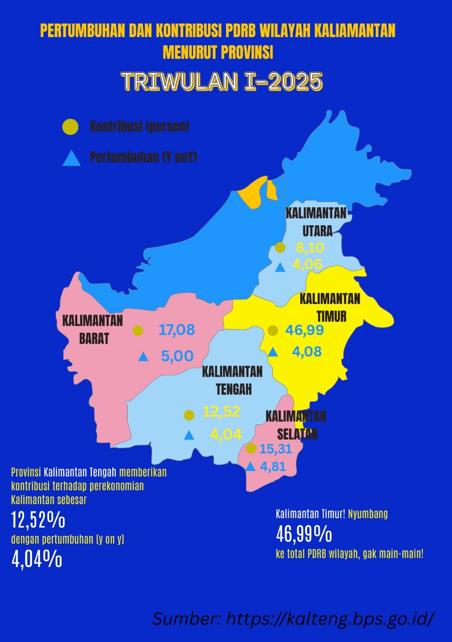 Kontribusi Kalimantan Tengah dalam mendorong Pertumbuhan PDRB Pulau Kalimantan adalah sebesar 12,52%. Kontribusi terbesar terhadap Pertumbuhan PDRB Kalimantan di sumbangkan oleh Kalimantan Timur sebesar 46,99%,...