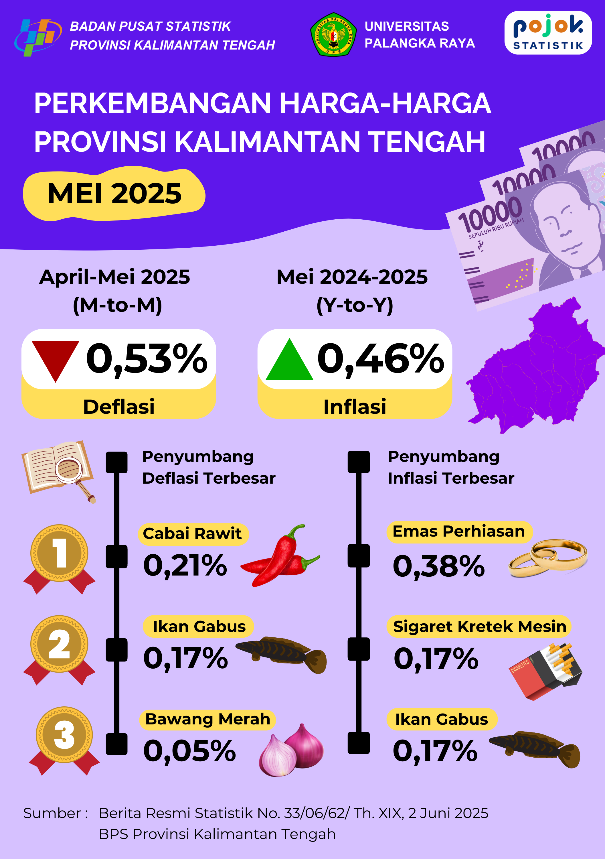 Pada Mei 2025, harga-harga di Provinsi Kalimantan Tengah mengalami deflasi atau penurunan harga dibandingkan bulan sebelumnya (m-to-m) sebesar 0,53 persen dengan penyumbang deflasi terbesar dari...